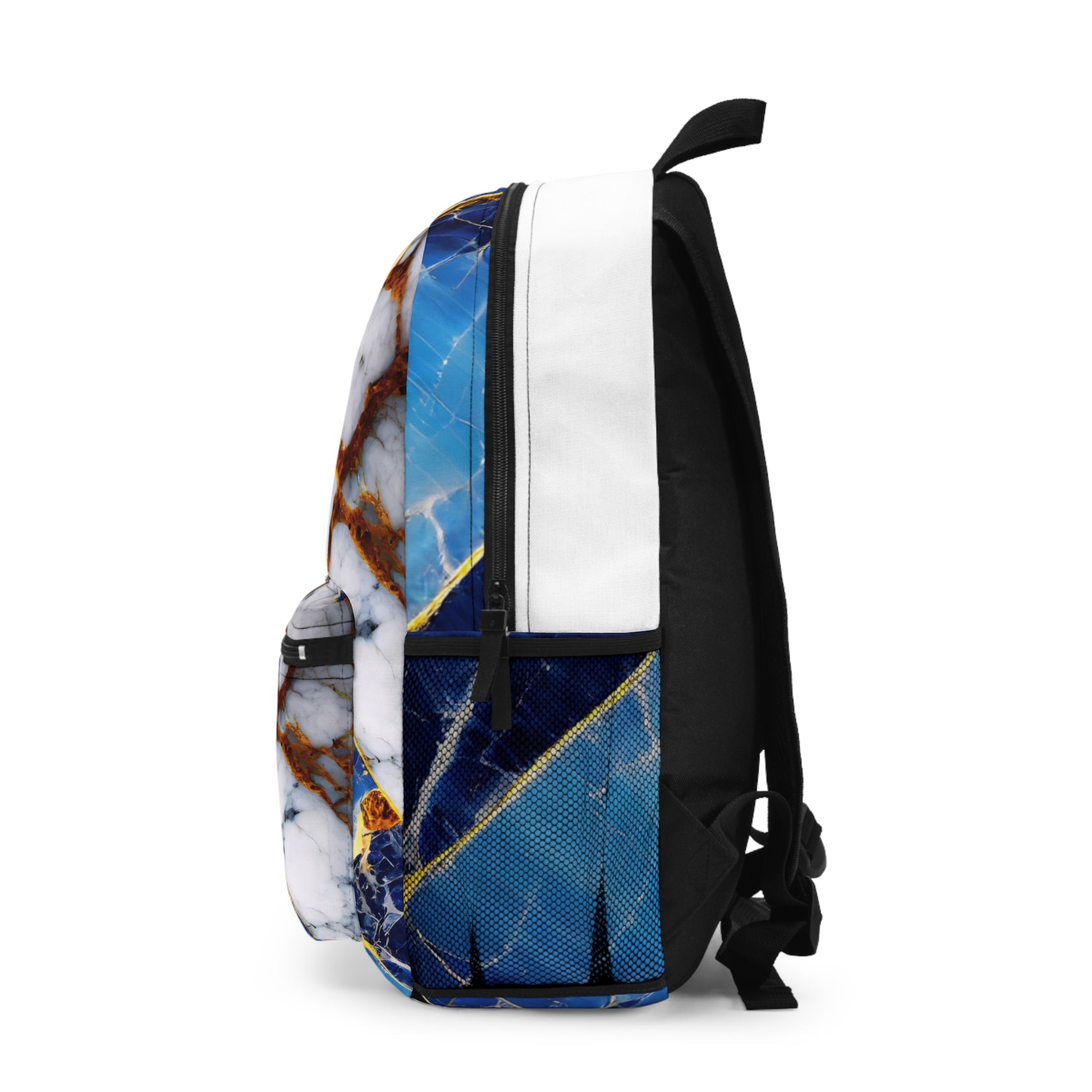 Carry bold luxury, stay organized. This backpack features the Sapphire Veins design with deep blues, crisp marble veining, and warm gold accents—perfect for commutes, school days, and weekend runs when you want your bag to feel like a statement. With multiple pockets and a padded back panel, it's built for everyday movement and easy organization.