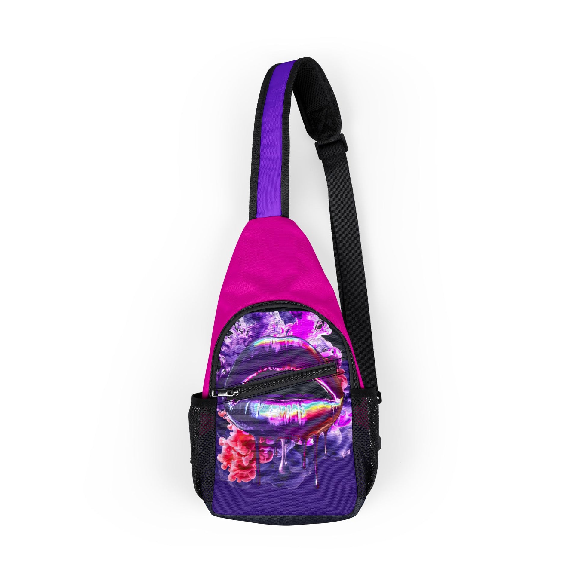 Compact style for everyday adventures. This durable nylon chest bag features the Purple Haze Lips design with iridescent dripping lips and a smoky purple-magenta burst—perfect for quick commutes, bike rides, festivals, or keeping your essentials close and accessible. The adjustable strap wears comfortably crossbody or over one shoulder.
