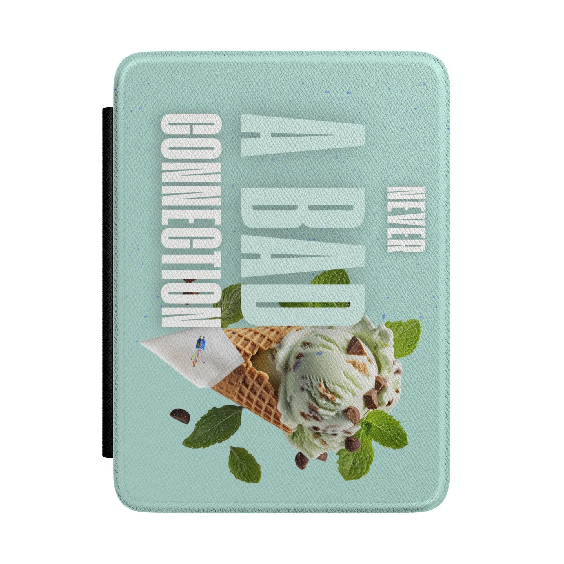 This “Never a Bad Connection” e‑reader case brings the Mint Ice Cream design to your reading setup with a clean, playful look that still feels premium in-hand. The cover features a mint background with bold “NEVER A BAD CONNECTION” lettering and a mint ice cream cone graphic, finished on a Saffiano-style leatherette texture that’s made to handle everyday use.