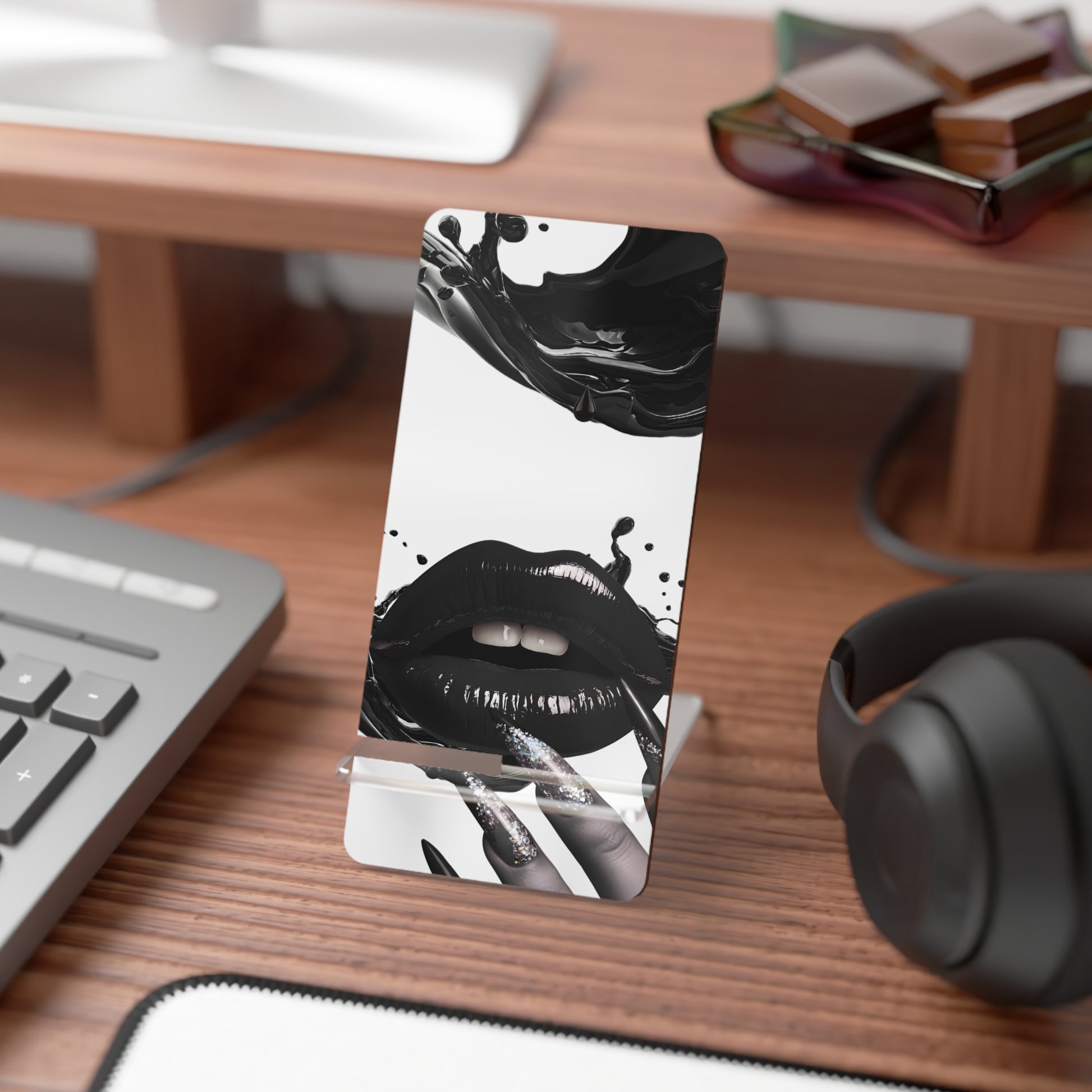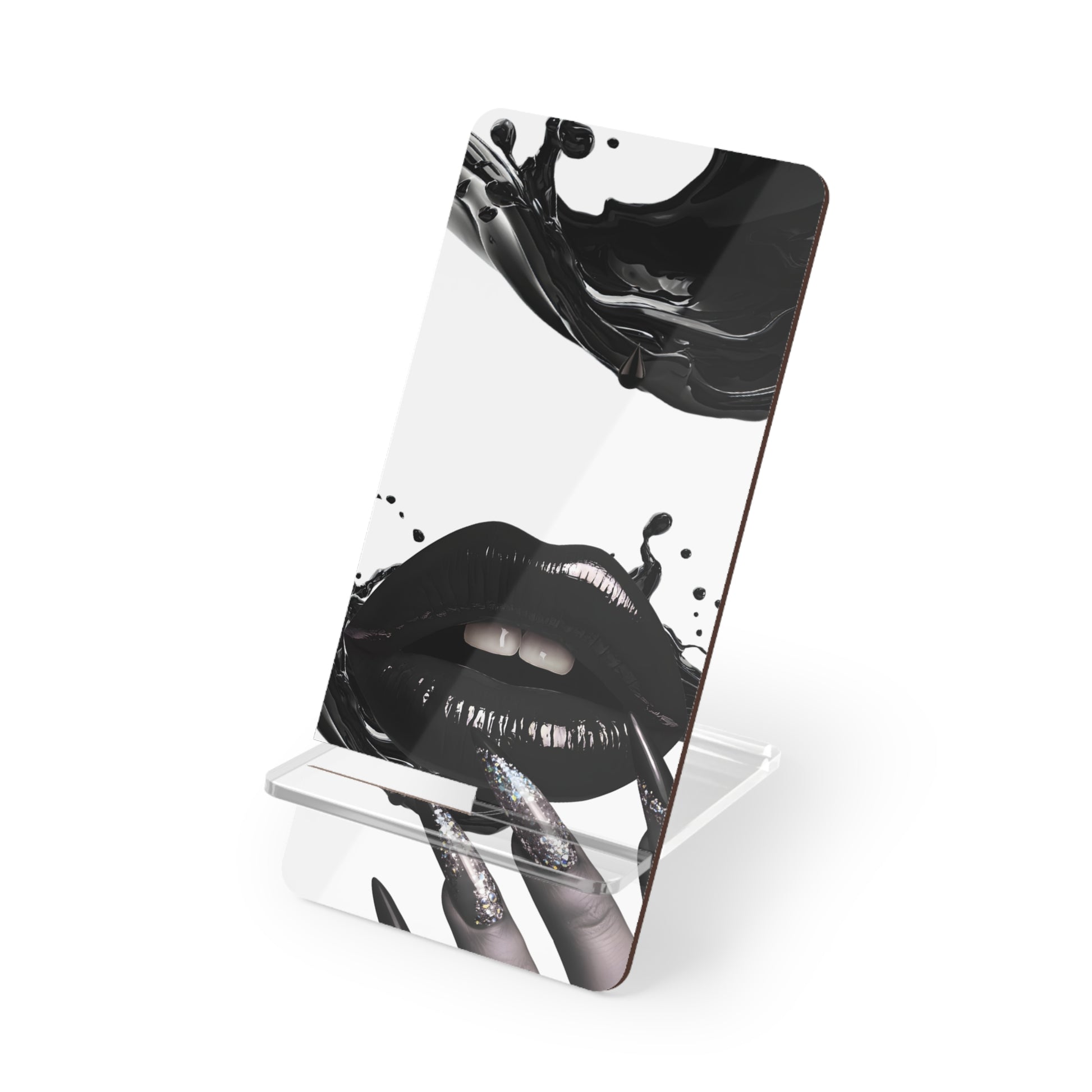 A little desk decor with a dark-gloss edge. This glossy phone stand features the Liquid Noir design—black lips, ink splash, and glitter accents—perfect for video calls, recipes, playlists, and hands-free scrolling. The two-piece setup snaps together fast and packs flat when you’re on the move.