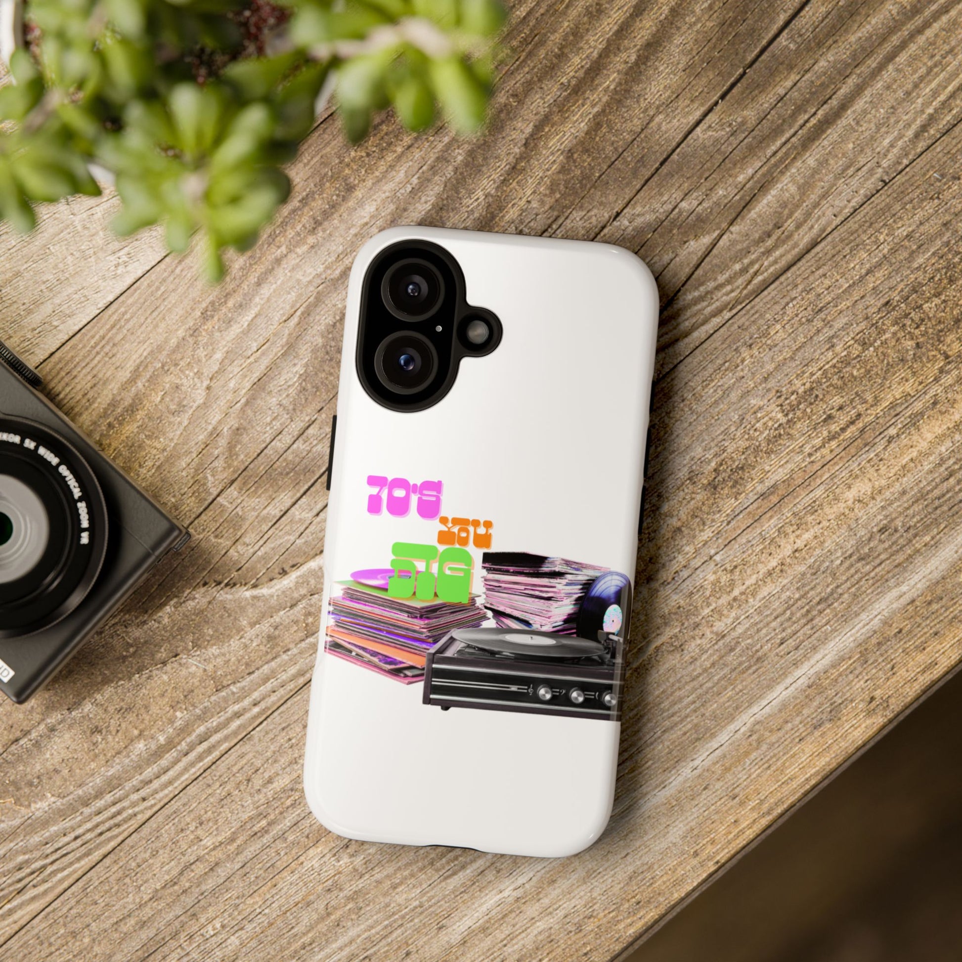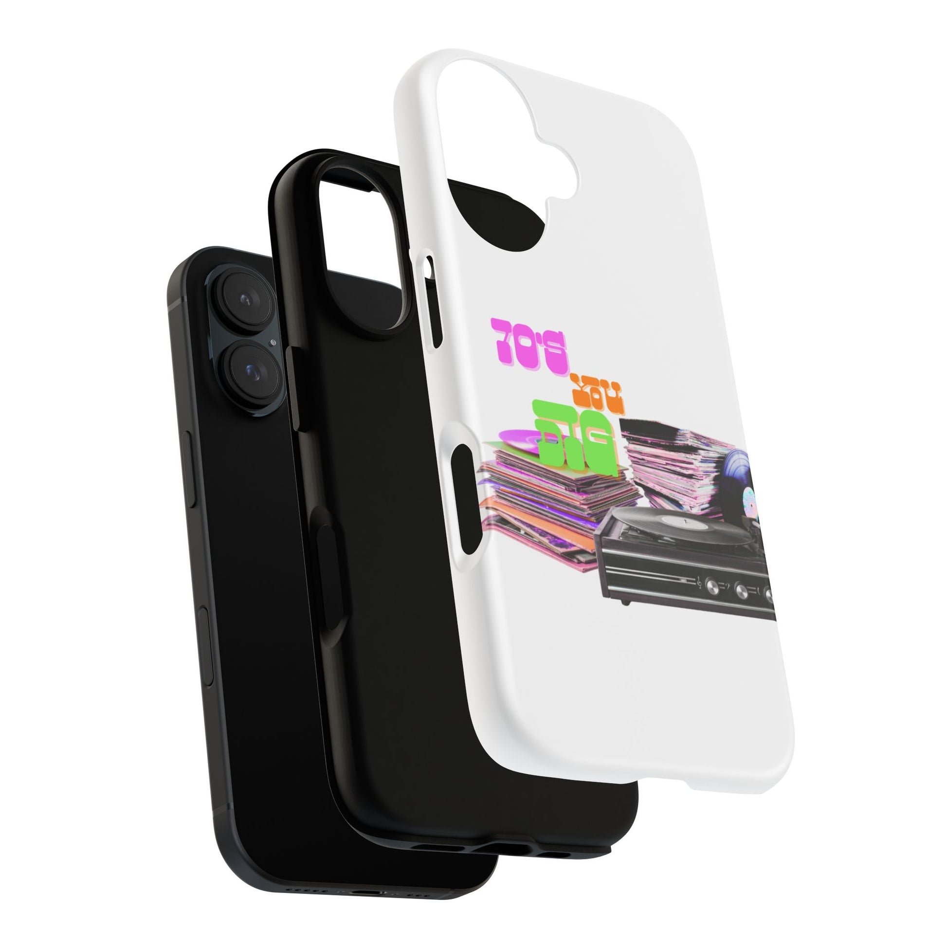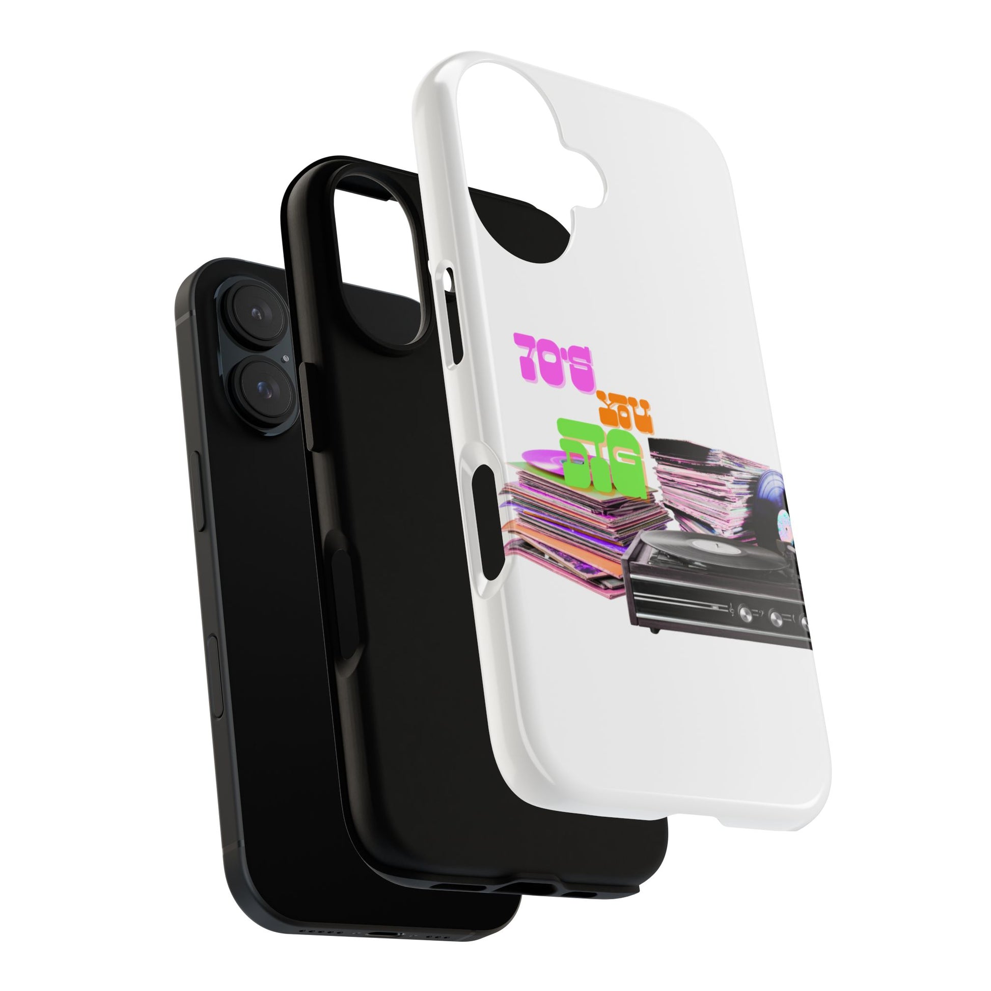 Spin some nostalgia into your pocket. This dual-layer protective case features the 70s Spin design with stacked records and a classic turntable on a clean white background—bringing that warm, analog vibe while helping protect your phone from everyday bumps and drops.