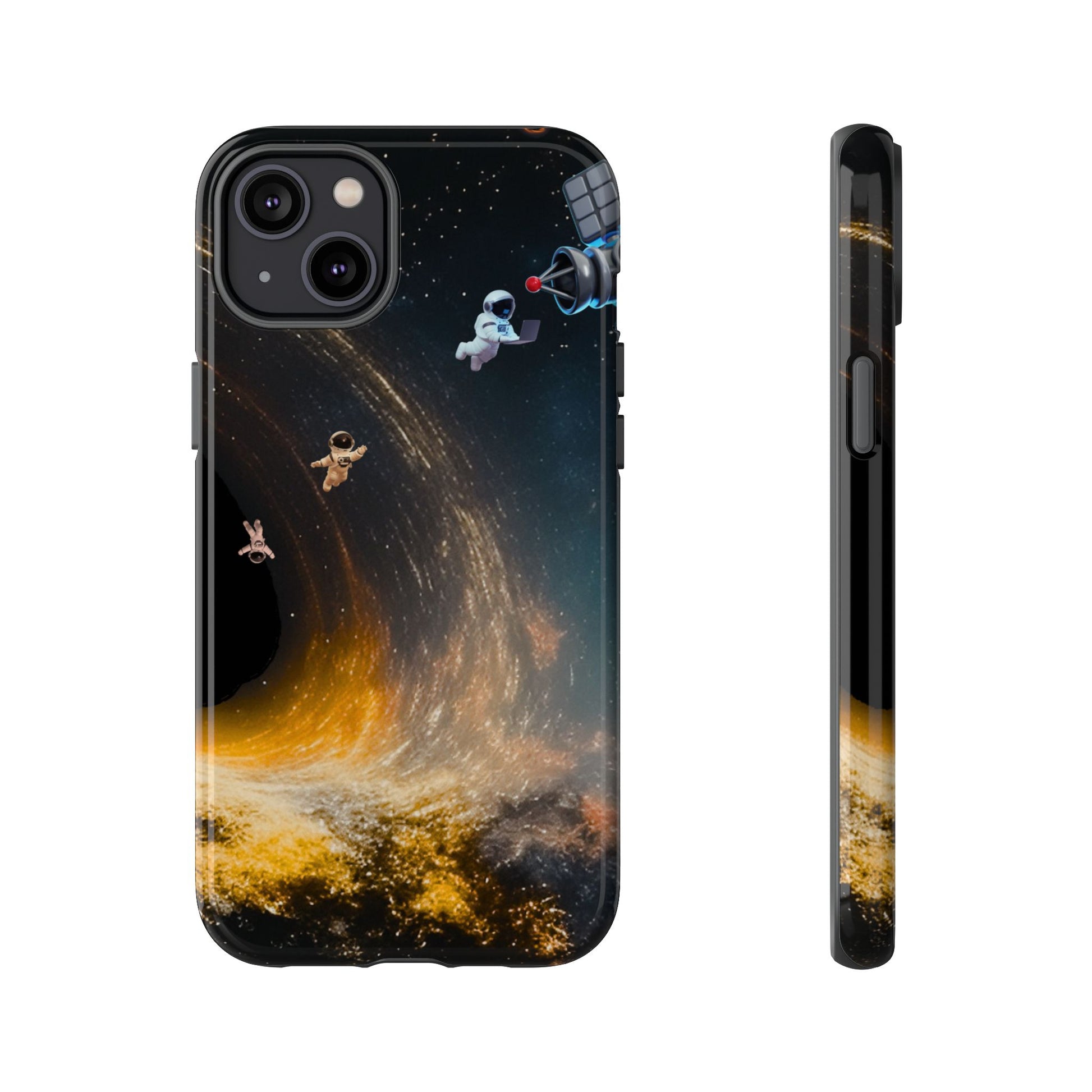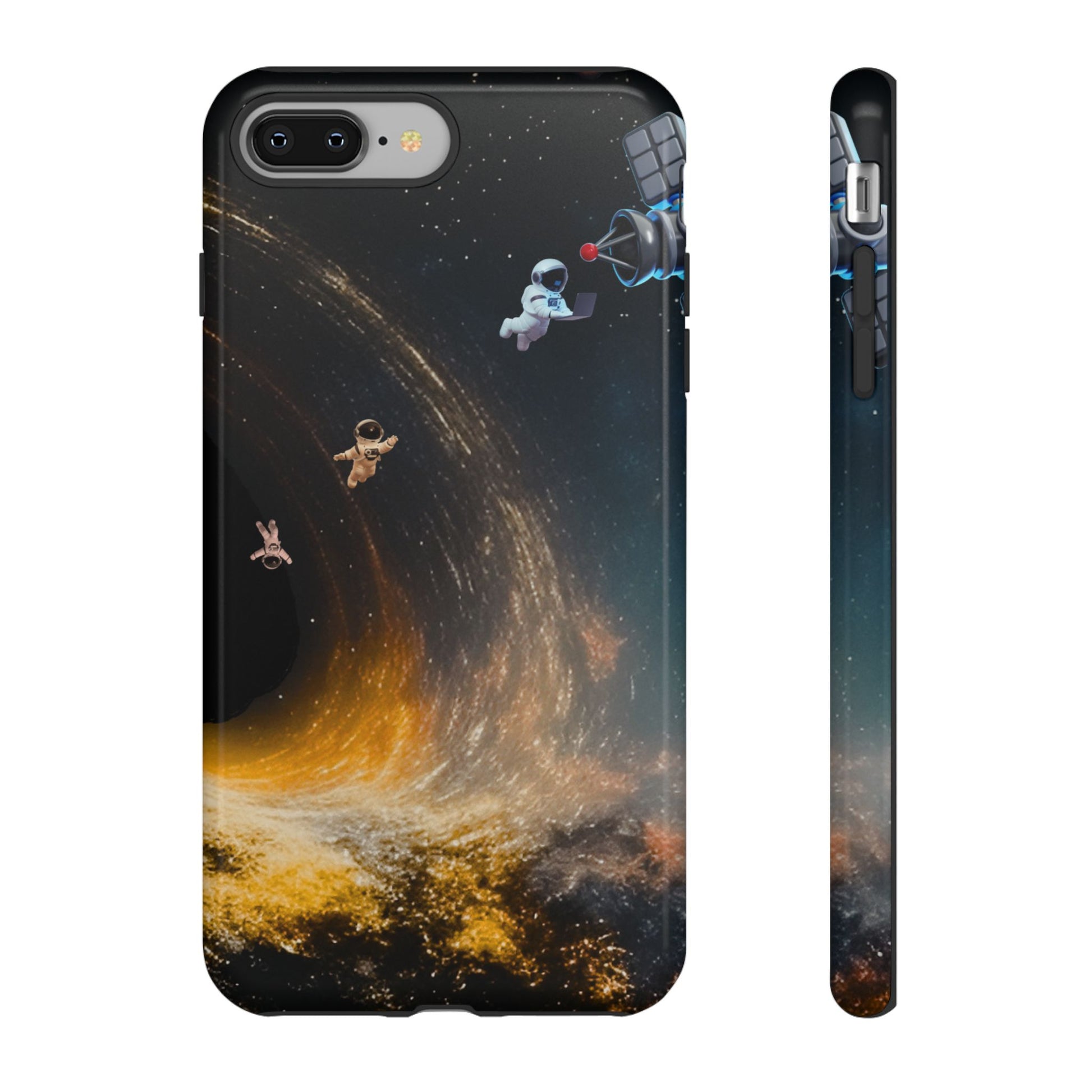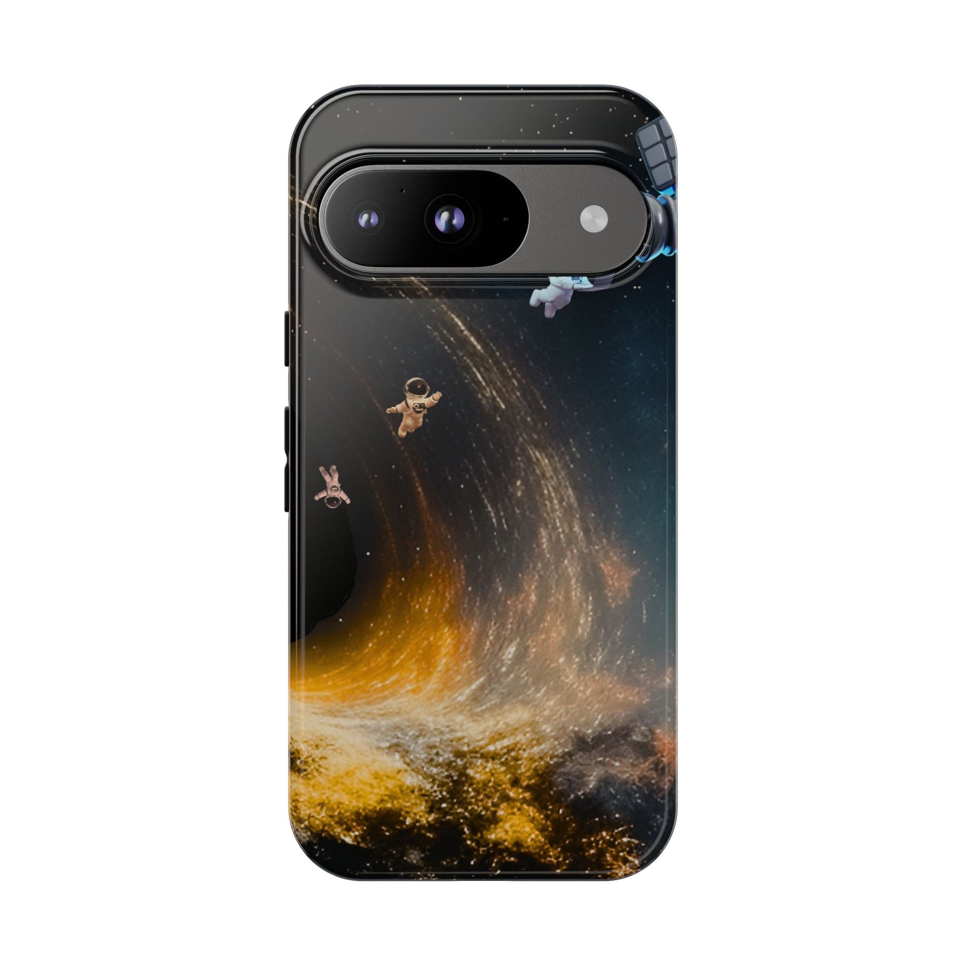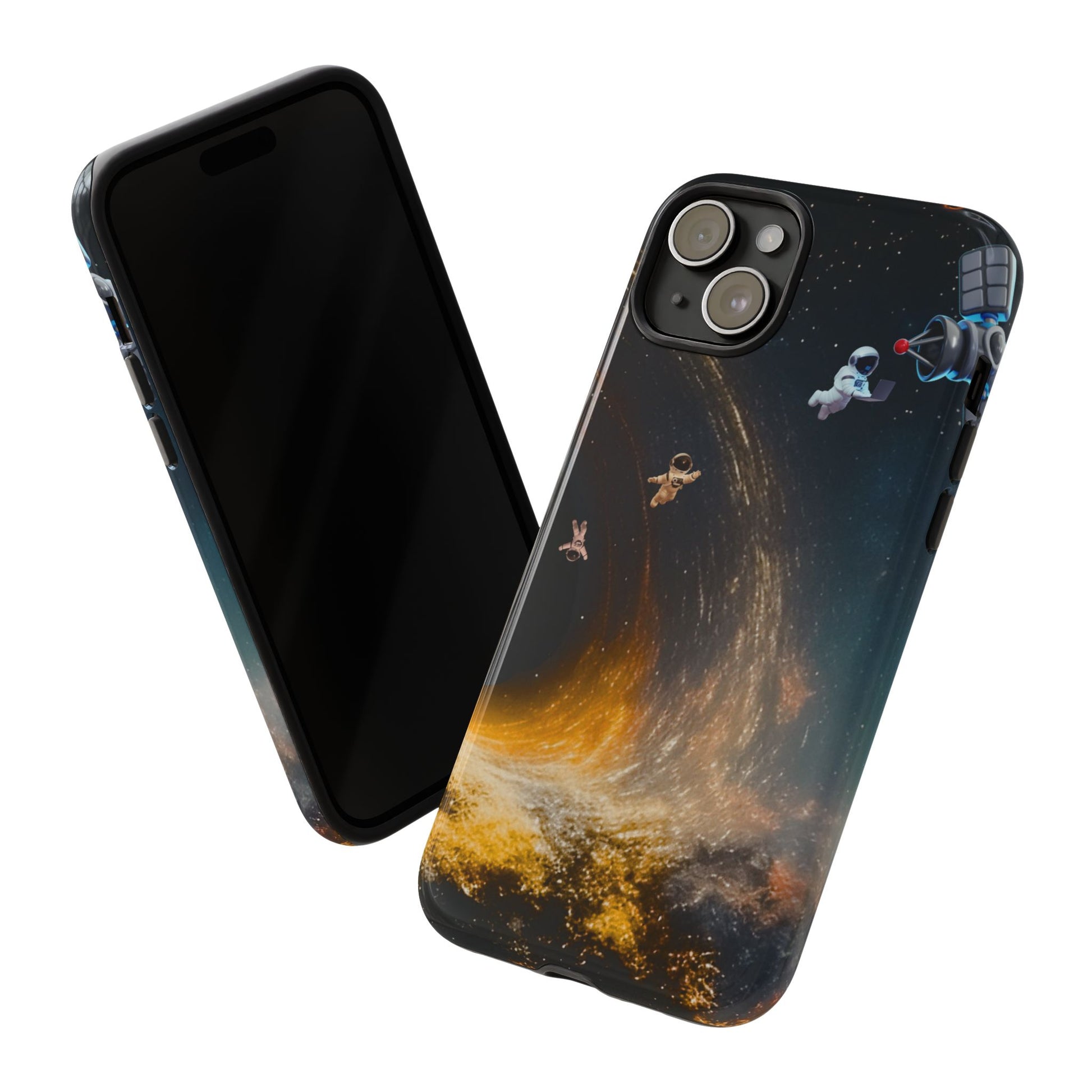 Space vibes, everyday protection. This dual-layer protective case features the Cosmic Drift design—astronauts floating through a swirling starfield with golden cosmic energy—so your phone feels like a mini space mission while staying protected from daily bumps and drops.