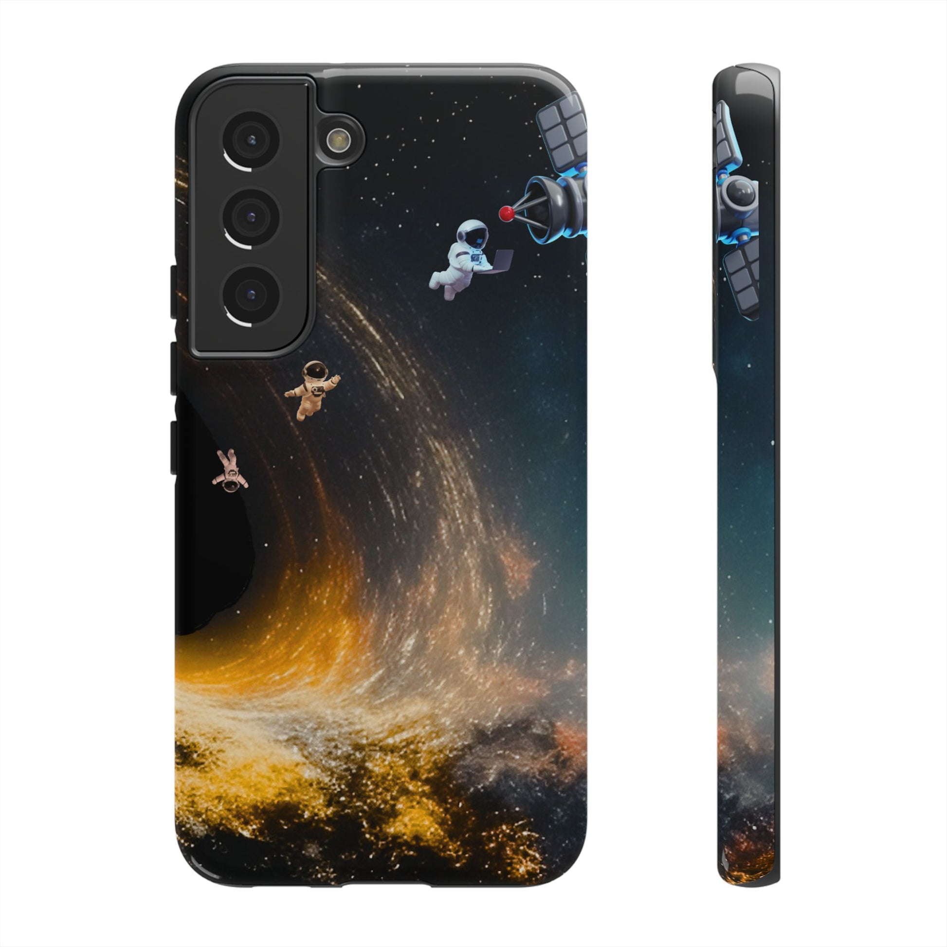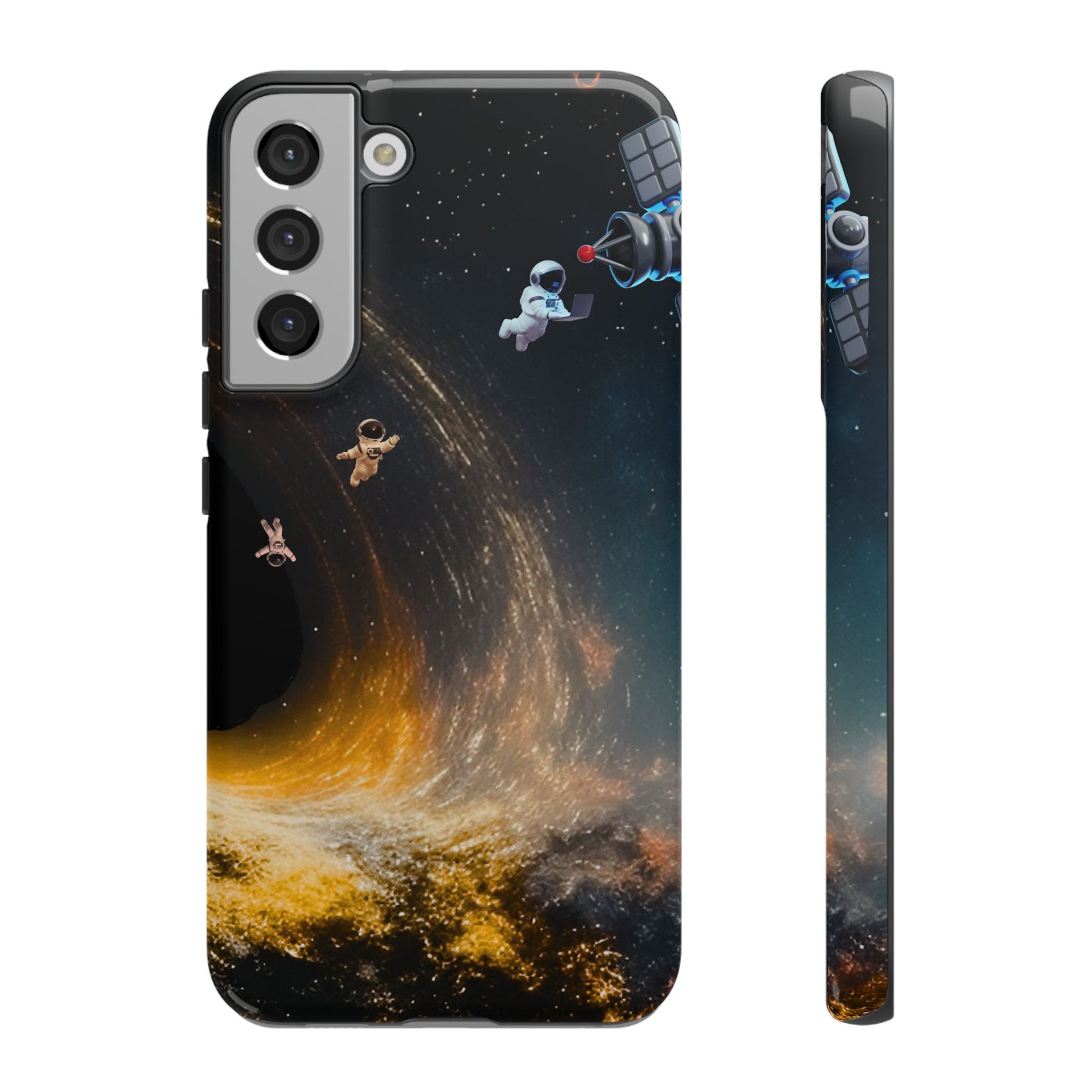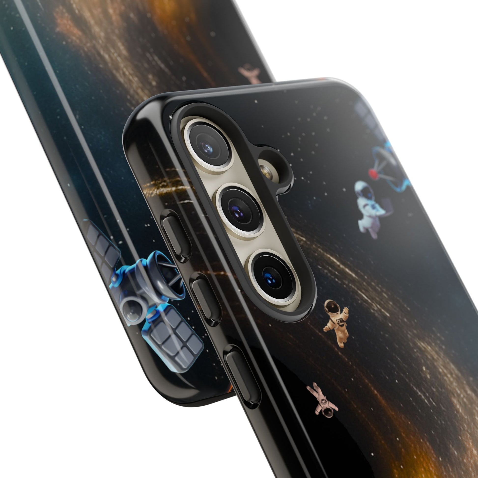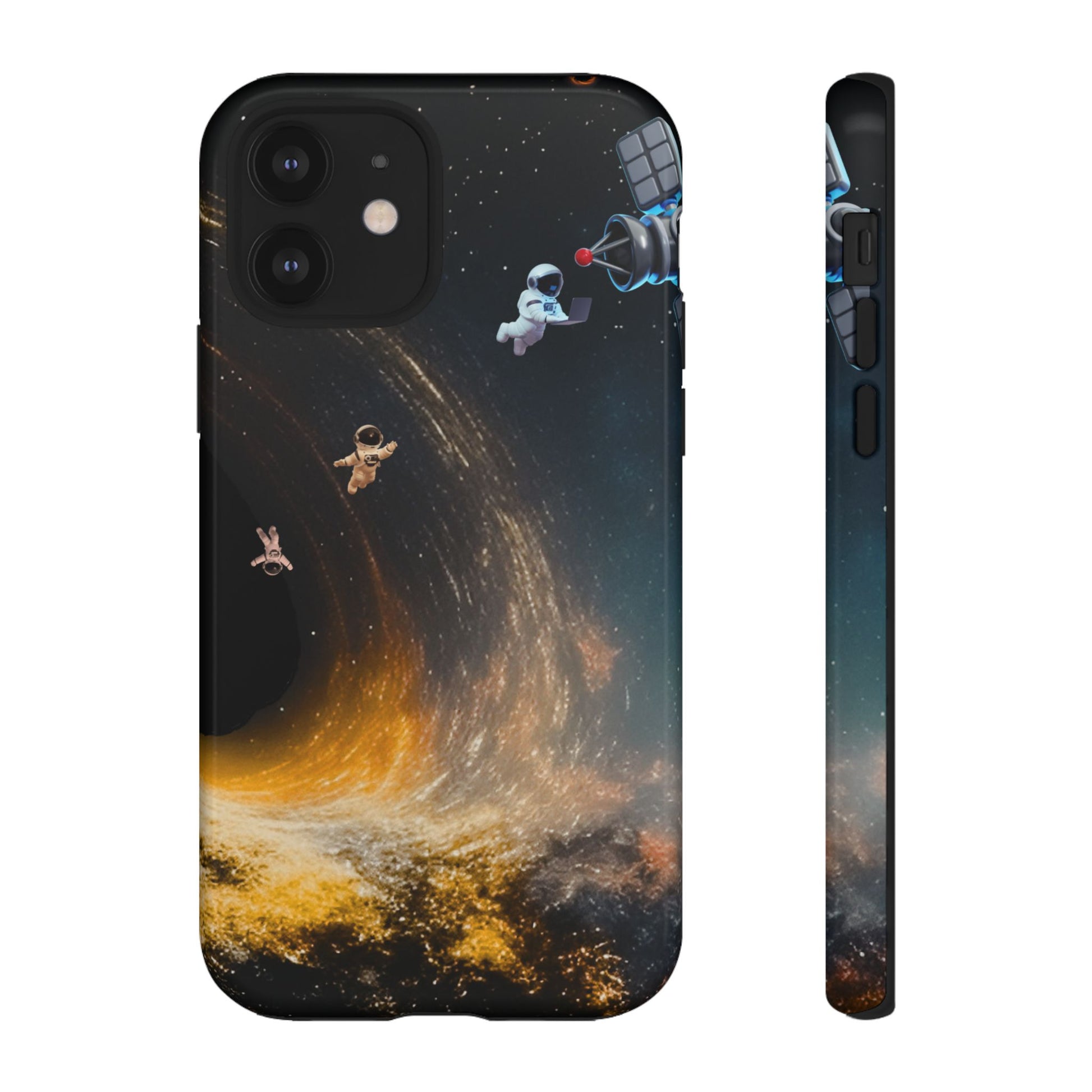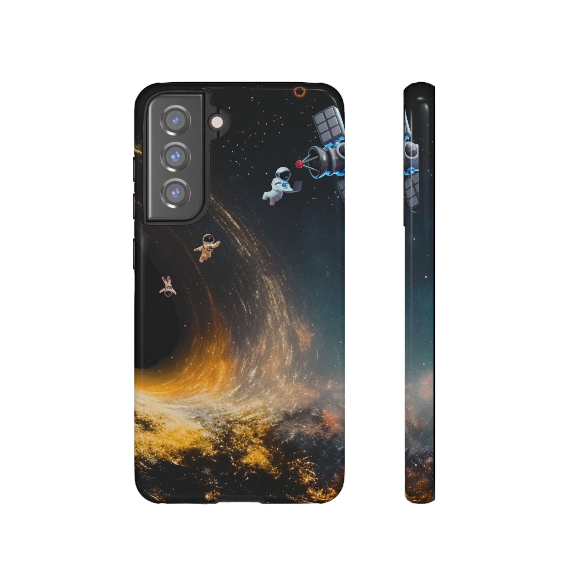 Space vibes, everyday protection. This dual-layer protective case features the Cosmic Drift design—astronauts floating through a swirling starfield with golden cosmic energy—so your phone feels like a mini space mission while staying protected from daily bumps and drops.