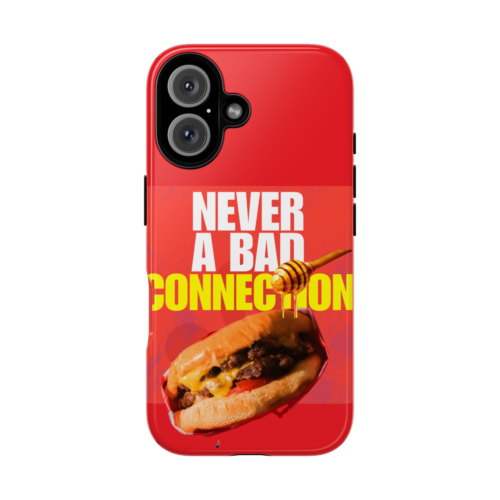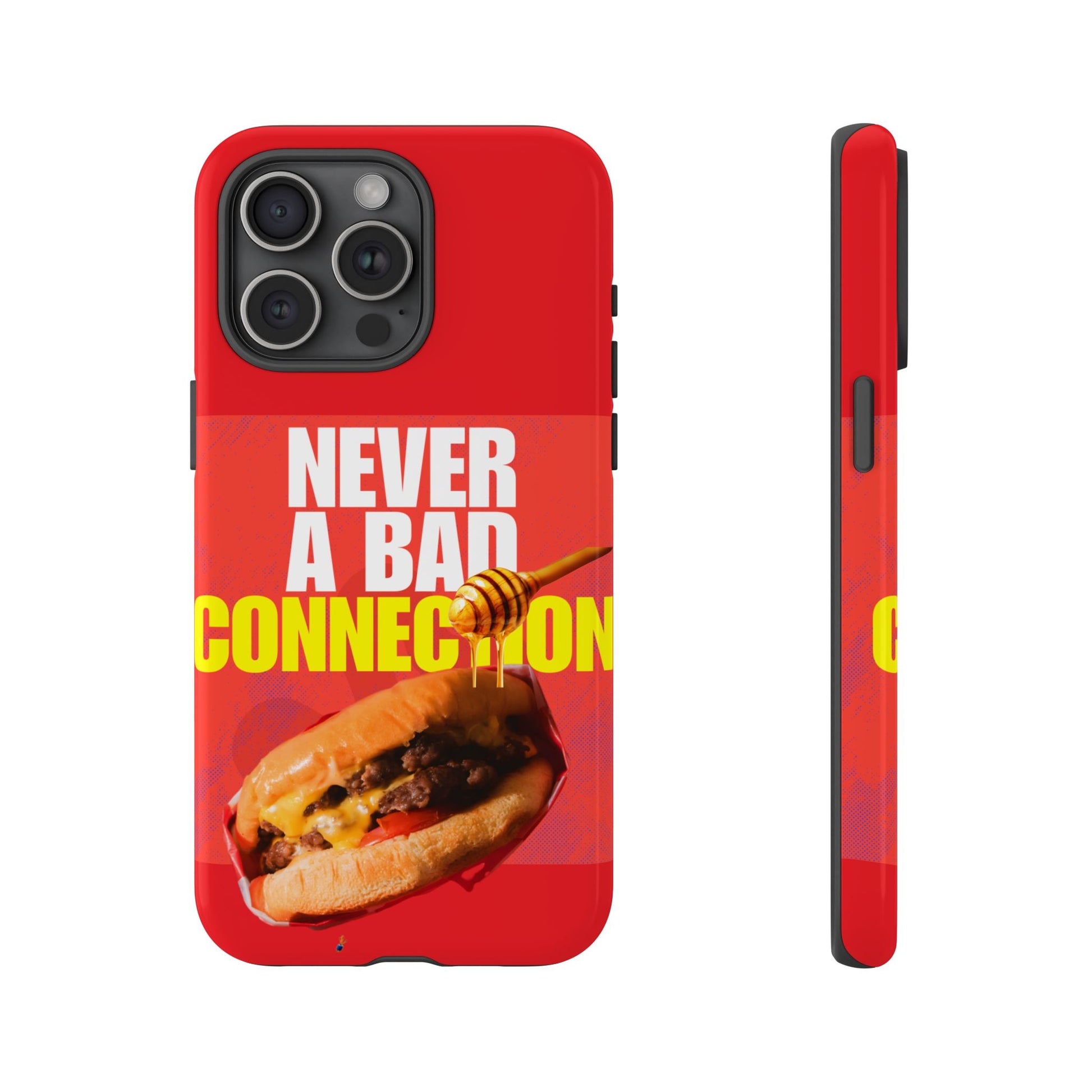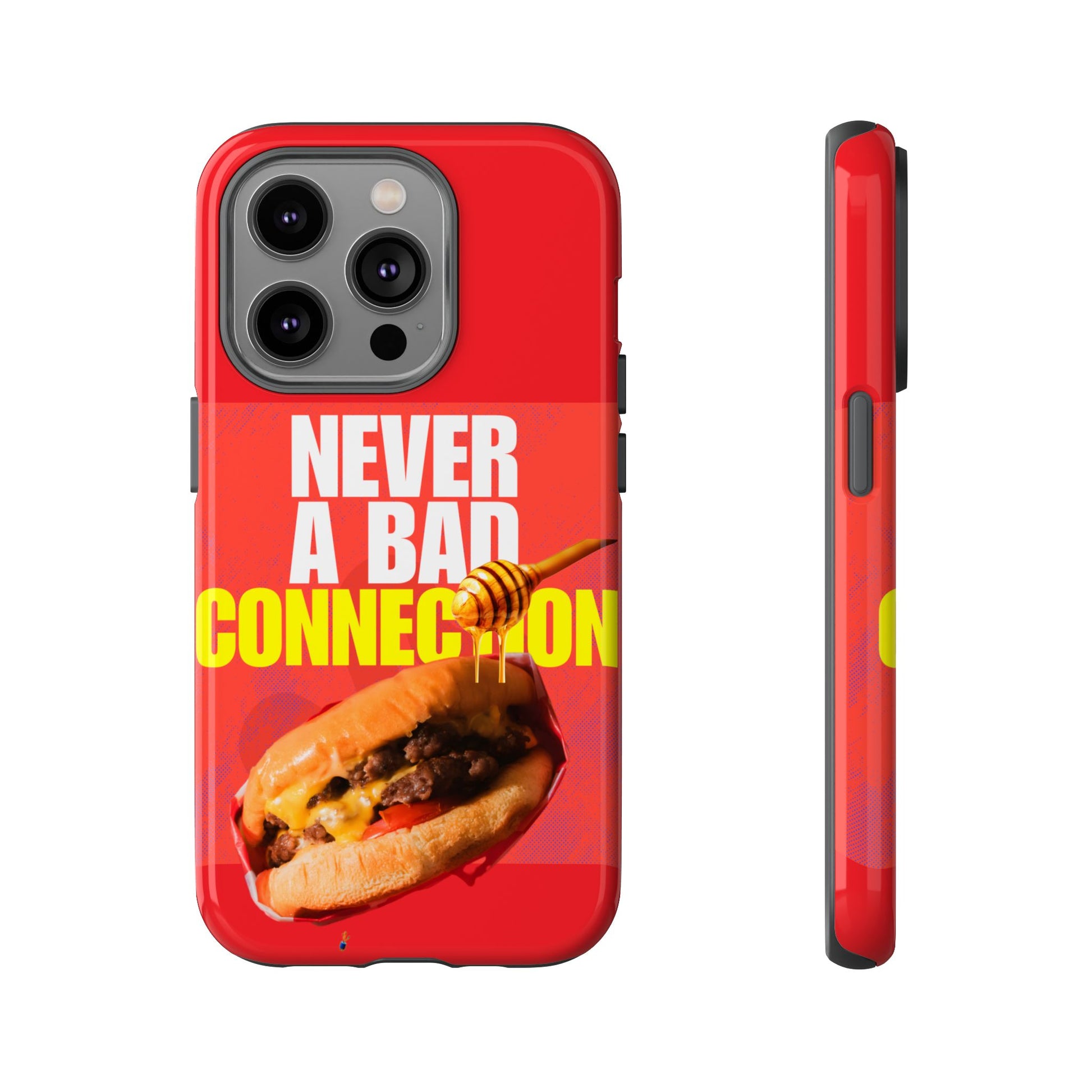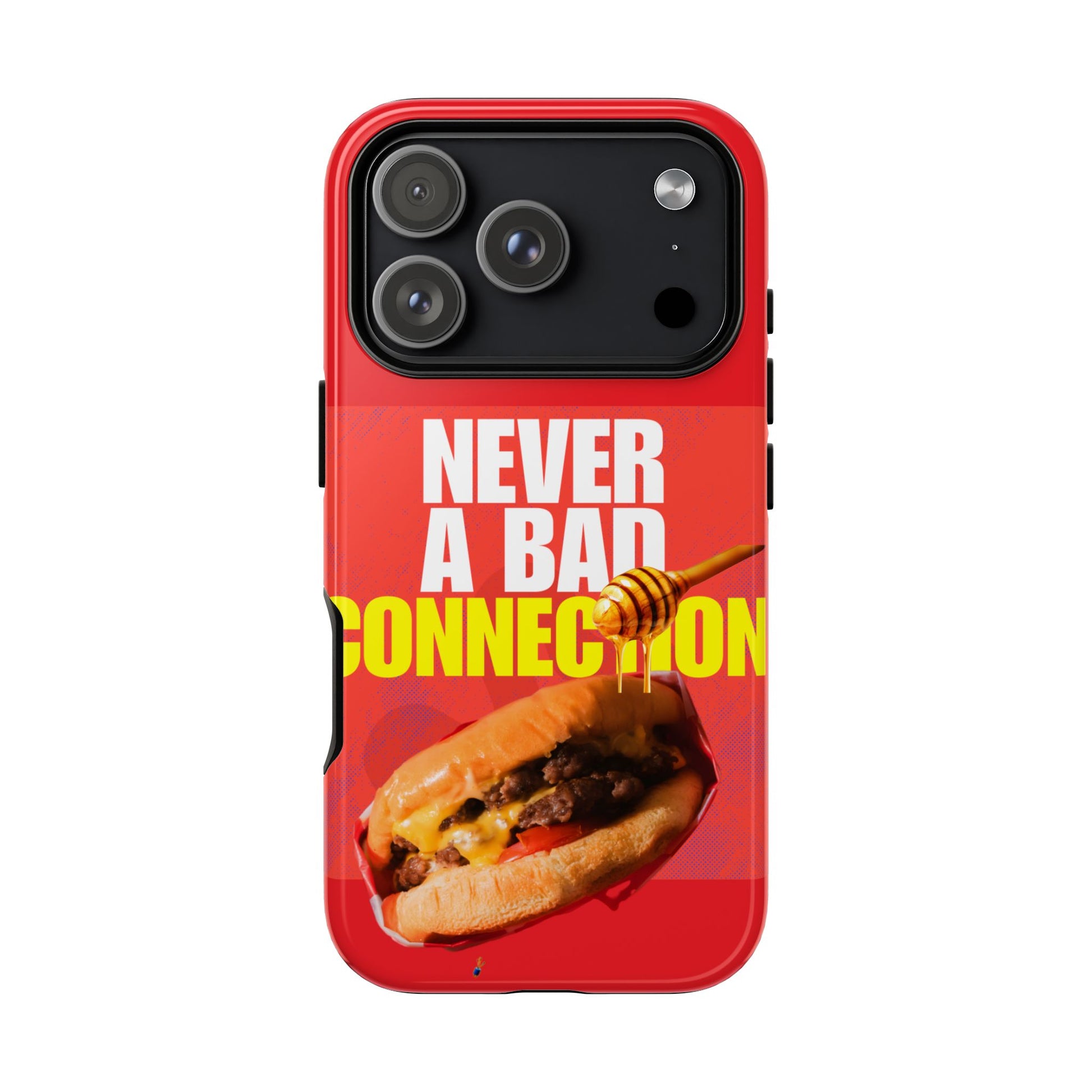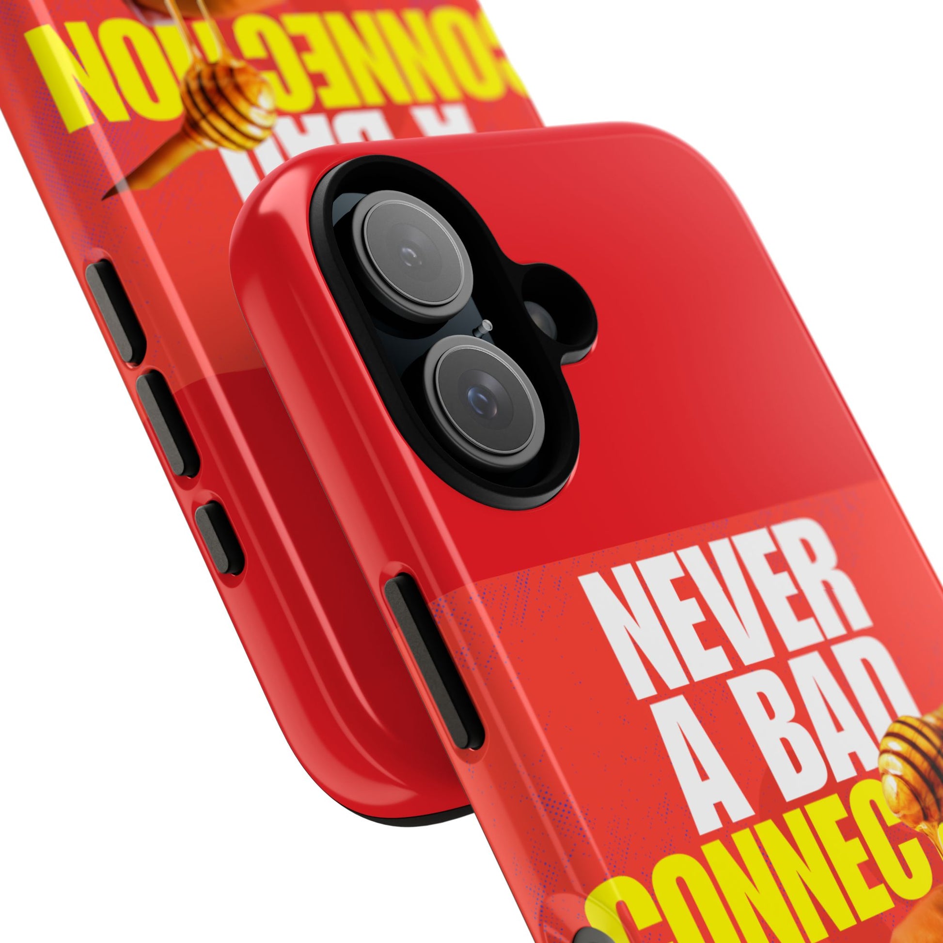 Bold, funny, and built for real life. This dual-layer protective case features a vivid red background with the "Never a Bad Connection" design—complete with a playful food-and-honey moment that wraps around your phone. The shock-absorbing inner layer helps handle everyday drops, while the UV-protected finish keeps colors bright.