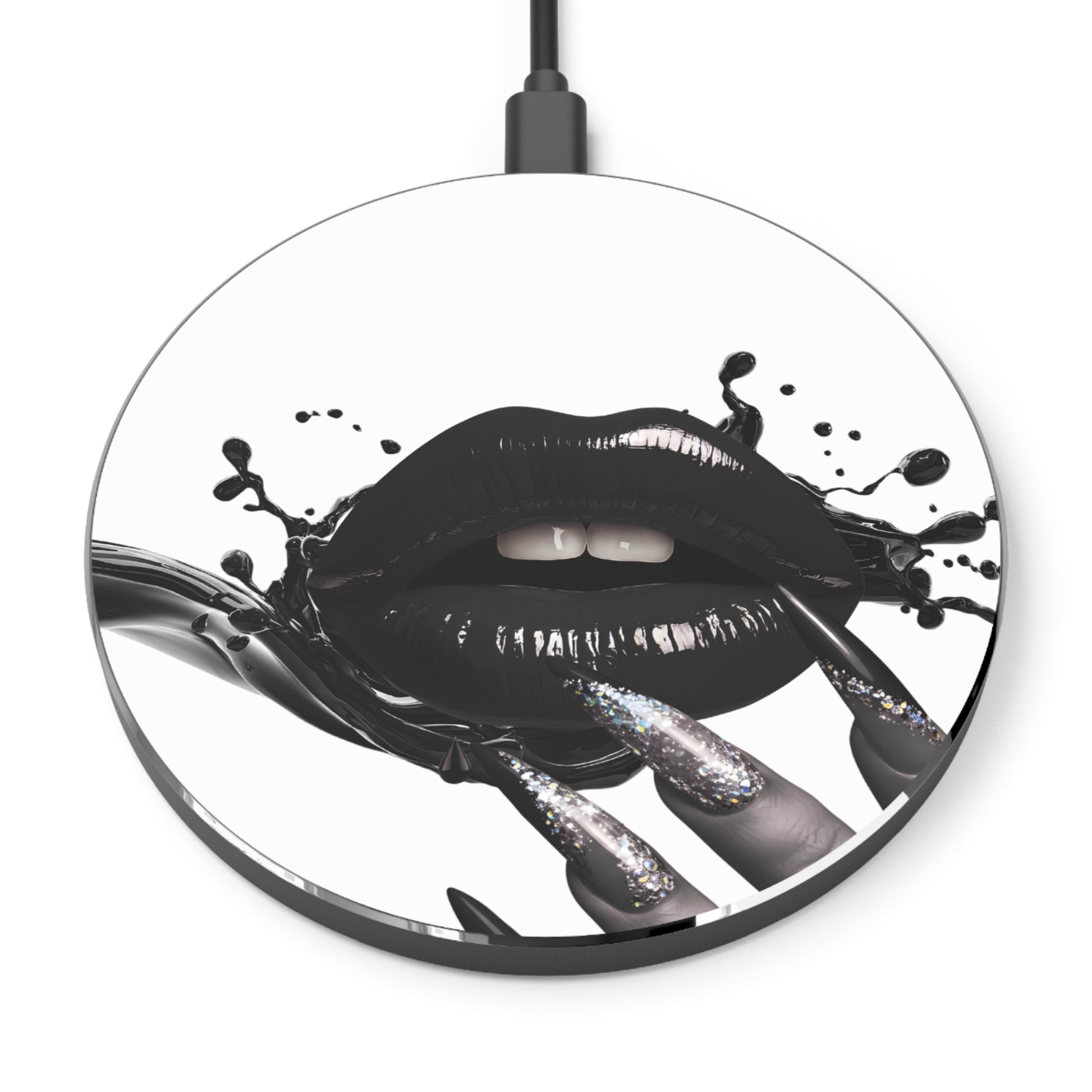 Bold energy, touch-free charging. This slim wireless charger features the Liquid Noir design—glossy black lips with ink-splash drama and glitter accents—perfect for desks, nightstands, and anywhere you want your charging spot to look like art. Just set your phone down and let it charge.