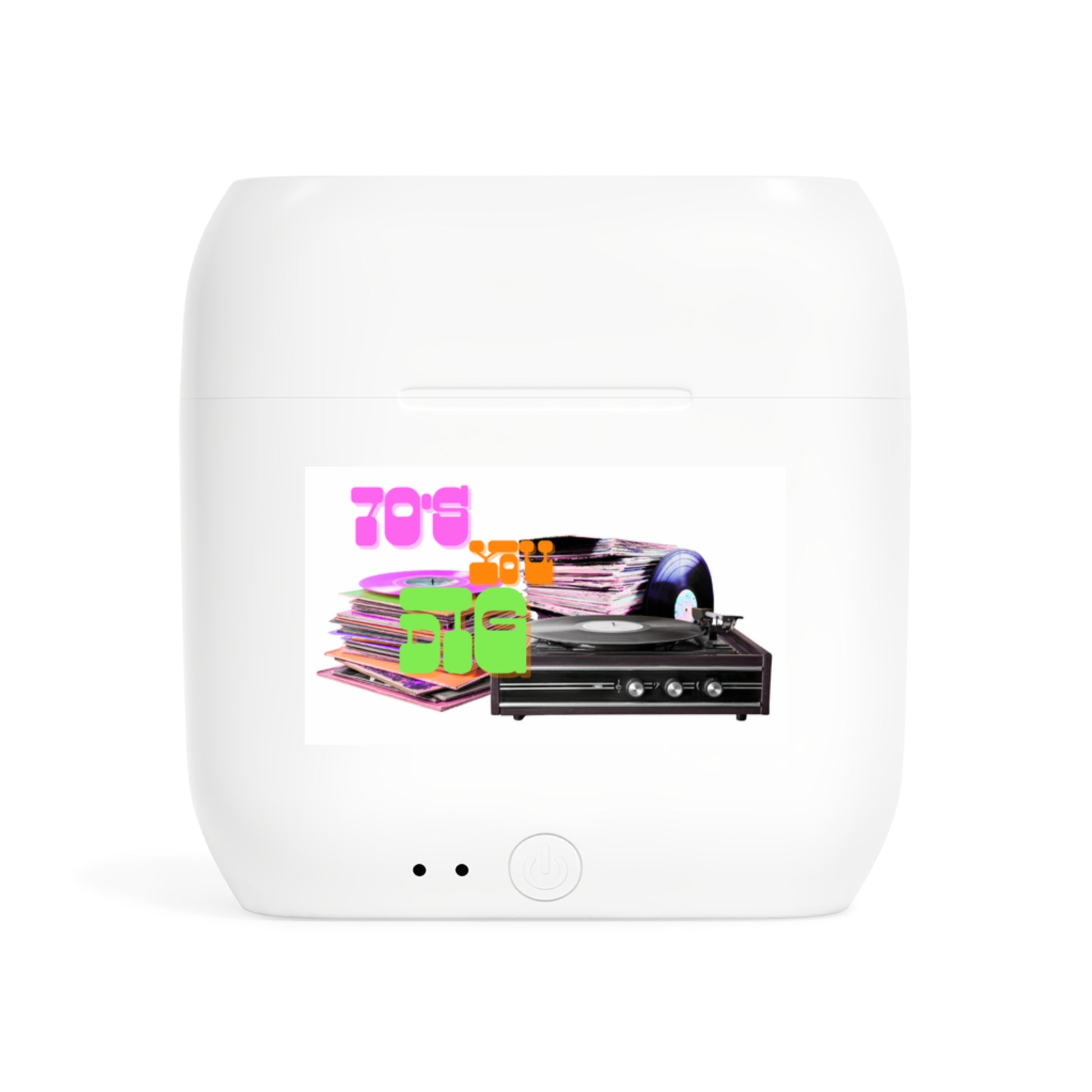 Pocket-size sound with retro record-shop energy. These compact wireless earbuds keep your day moving with easy auto-pairing, built-in controls, and a custom case featuring the 70s Spin design. The case adds personality to your everyday carry while keeping your earbuds protected between commutes, workouts, and work sessions.