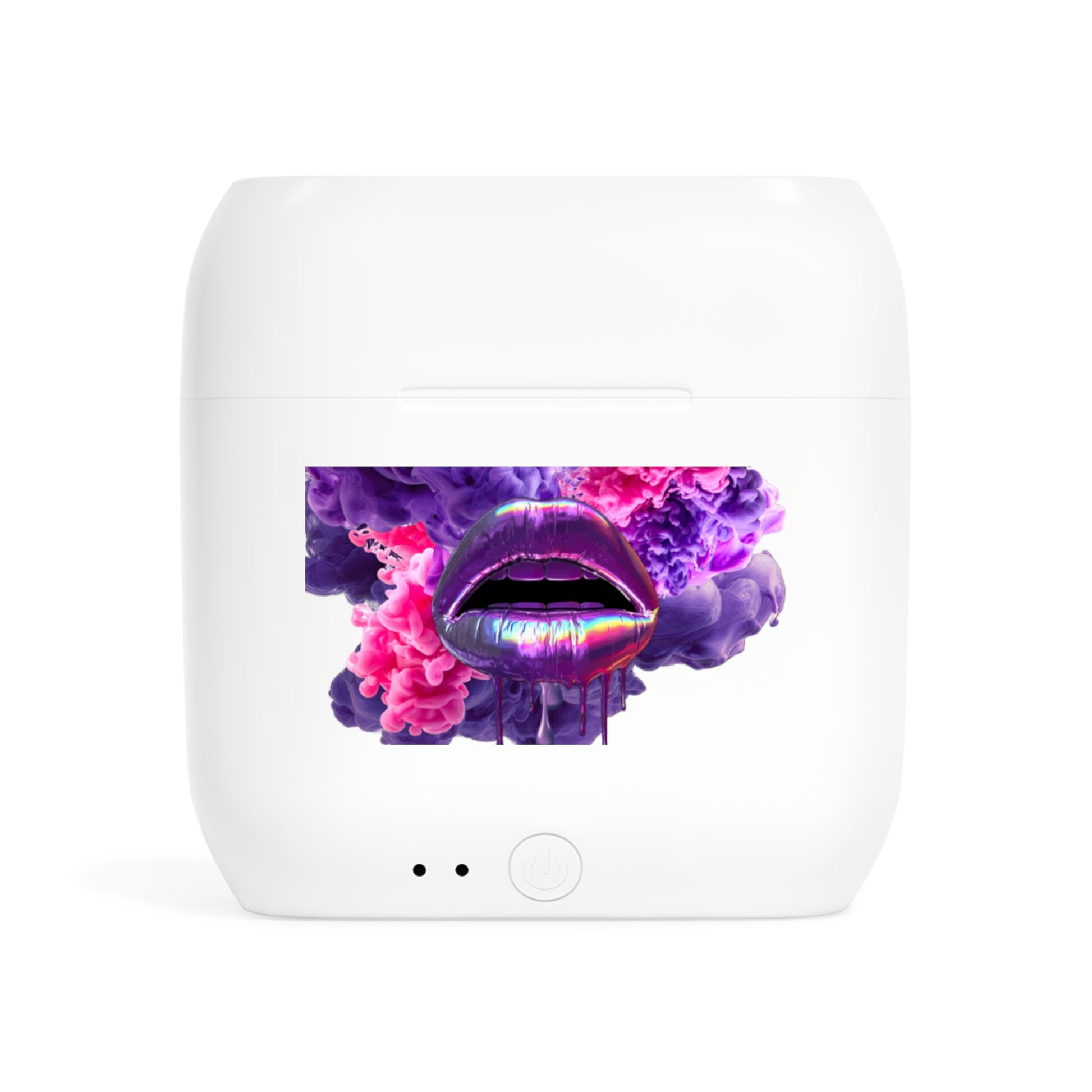 Pocket-size sound with bold, art-forward energy. These compact wireless earbuds keep your day moving with easy auto-pairing, built-in controls, and a custom case featuring the Liquid Drip design—iridescent lips with a smoky color burst that stands out anywhere you set it down.