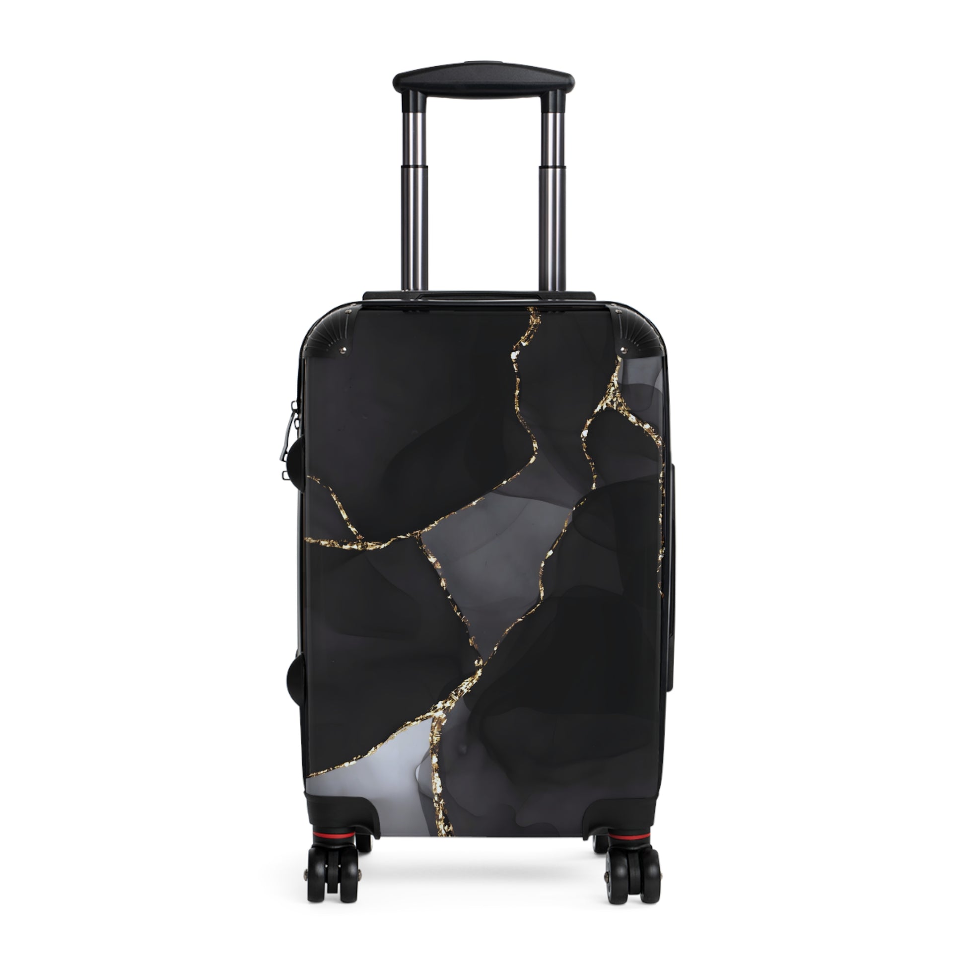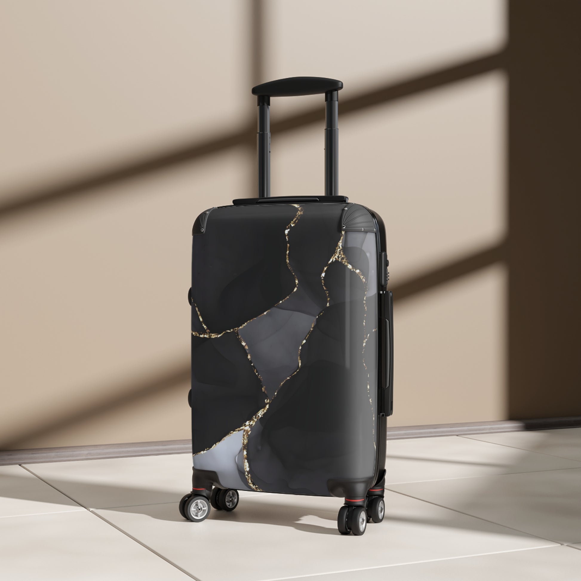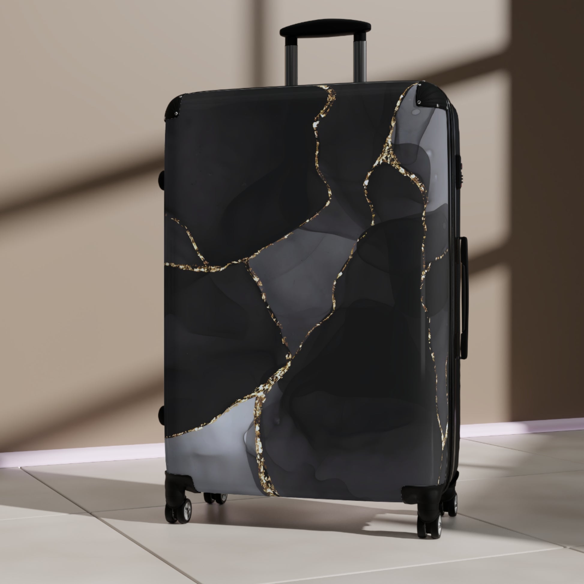 A sleek hard-shell suitcase with an artful, marbled front and reliable performance features. Deep black and smoky gray swirls are traced with metallic gold accents for a refined, gallery-ready look that’s easy to spot on any carousel. Inside, a removable lining and two inner pockets keep chargers, passports, and travel-size essentials organized and within reach. The ABS back adds rugged impact and scratch resistance while the lightweight build keeps things moving smoothly. Glide through terminals on four double 360° wheels with an adjustable telescopic handle, and lock it up with the built-in lock for stress-free travel. The largest size includes an extendable top-panel option when you need extra packing space.