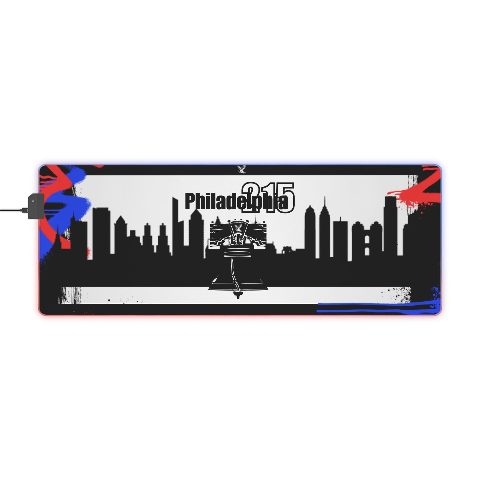 Light up your setup with city energy. This oversized LED desk mat features the Philadelphia 215 design with the Liberty Bell skyline and bold red-blue street-art accents—perfect for late-night gaming, streaming, or creative work. The RGB edge lighting lets you cycle through colors to match your mood, and the smooth surface keeps your mouse movement steady.