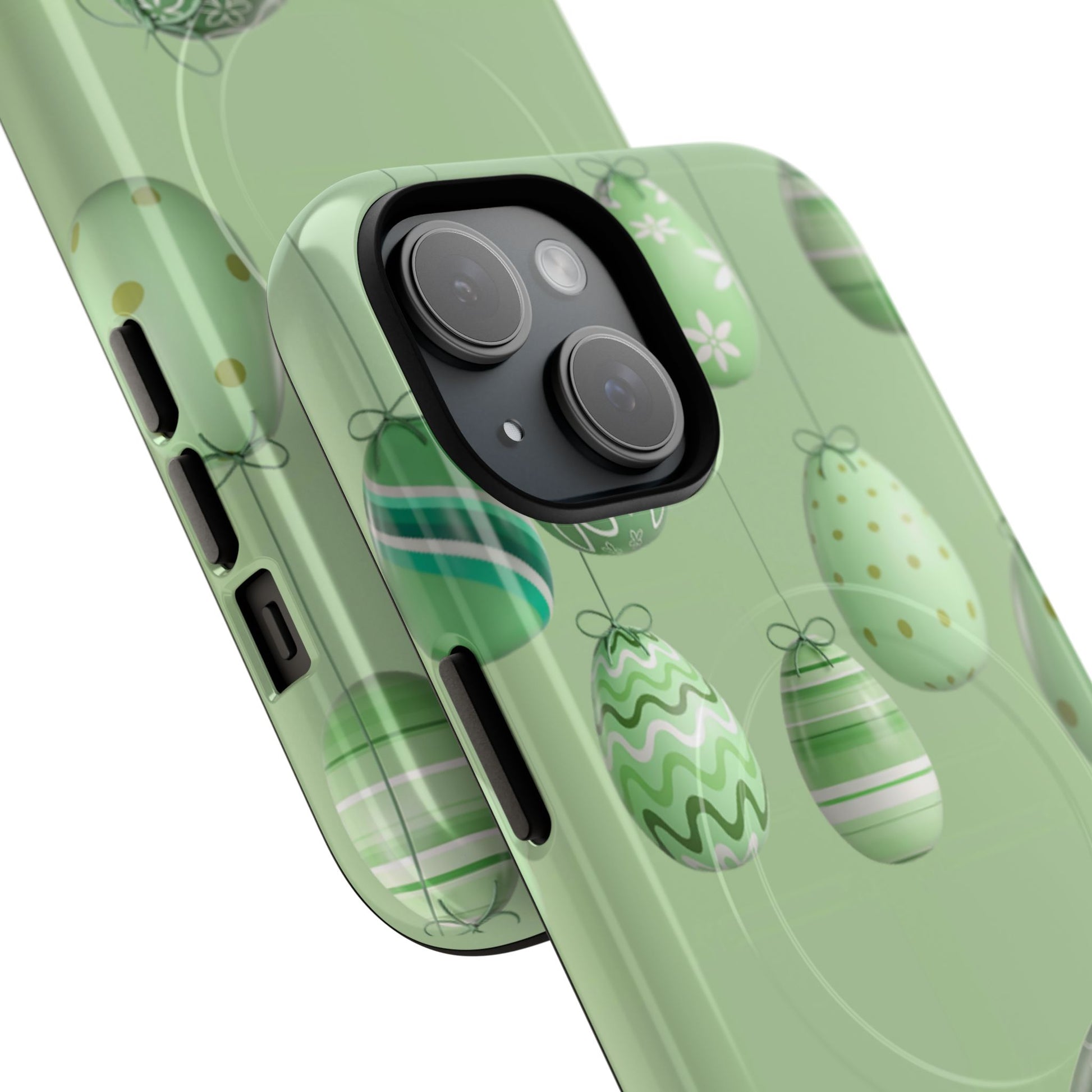 A protective phone case that feels like a little springtime moment in your hand. The slim, dual-layer build pairs a rigid polycarbonate shell with a soft TPU silicone liner to cushion shocks and keep your phone looking fresh. Delicate hanging decorative eggs float across a soothing green backdrop—a subtle, cheerful pattern that blends seasonal charm with everyday practicality. A built-in magnetic module makes wireless charging and accessory attachment effortless, while precise cutouts keep ports and buttons easy to reach.