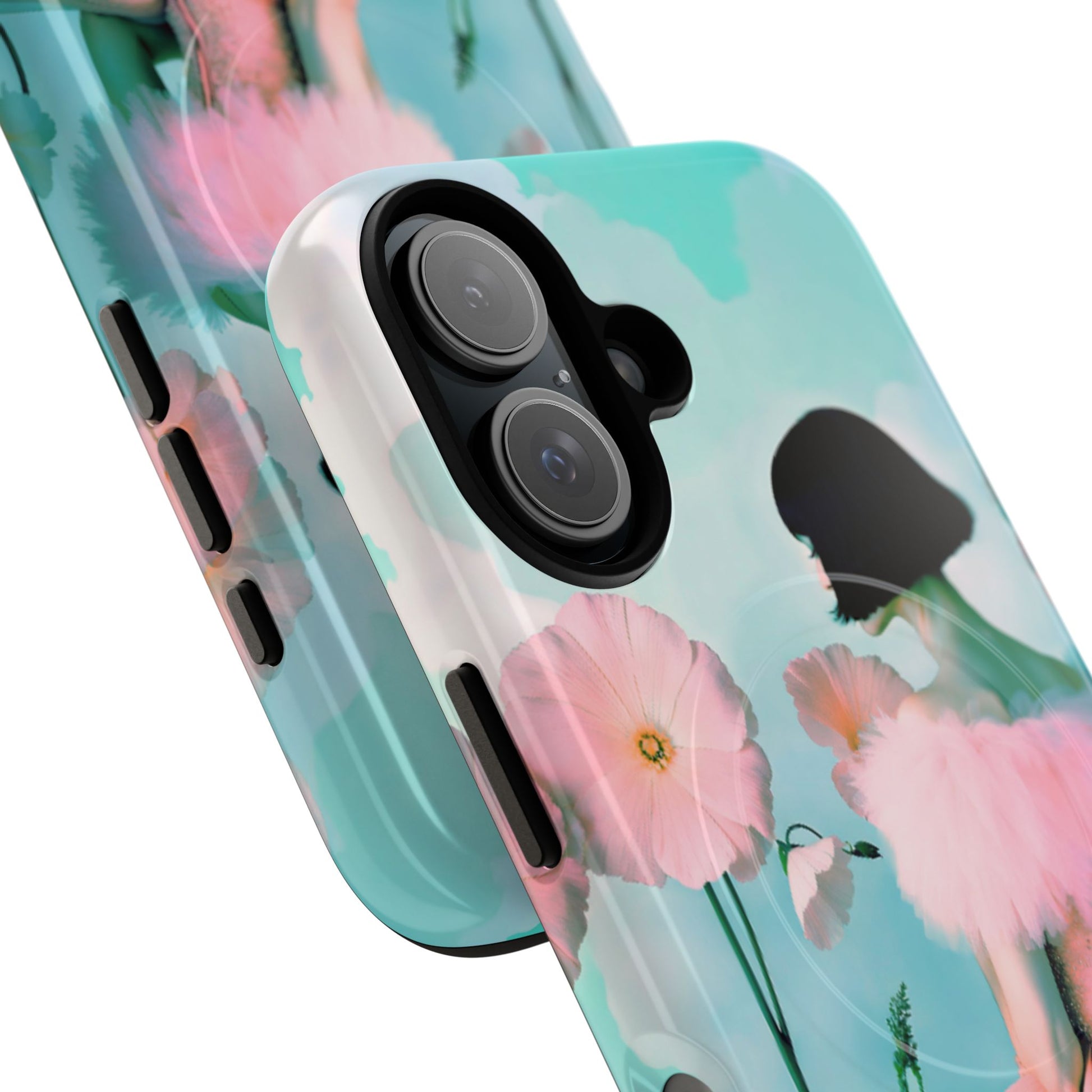 A feminine, dreamy phone case that blends soft pastels with real protection, featuring a ballerina-like silhouette floating through oversized blooms in a vivid, edge-to-edge wrap. The dual-layer build keeps your phone cushioned from everyday drops while staying lightweight and smooth in hand. Built-in magnetic compatibility helps keep magnetic chargers and accessories aligned, with precise cutouts so everything stays easy to use.
