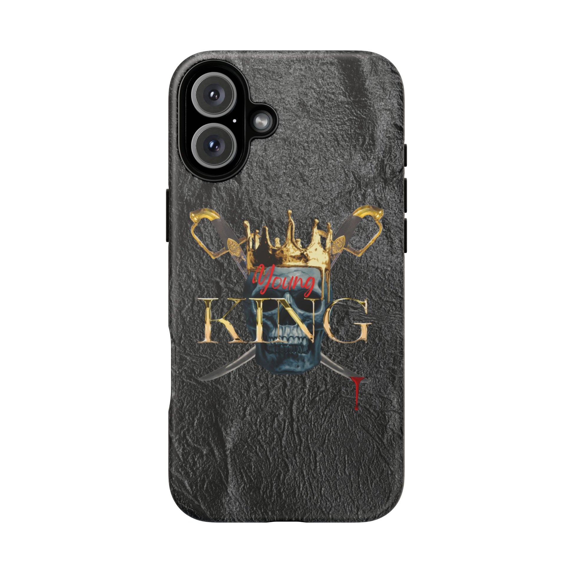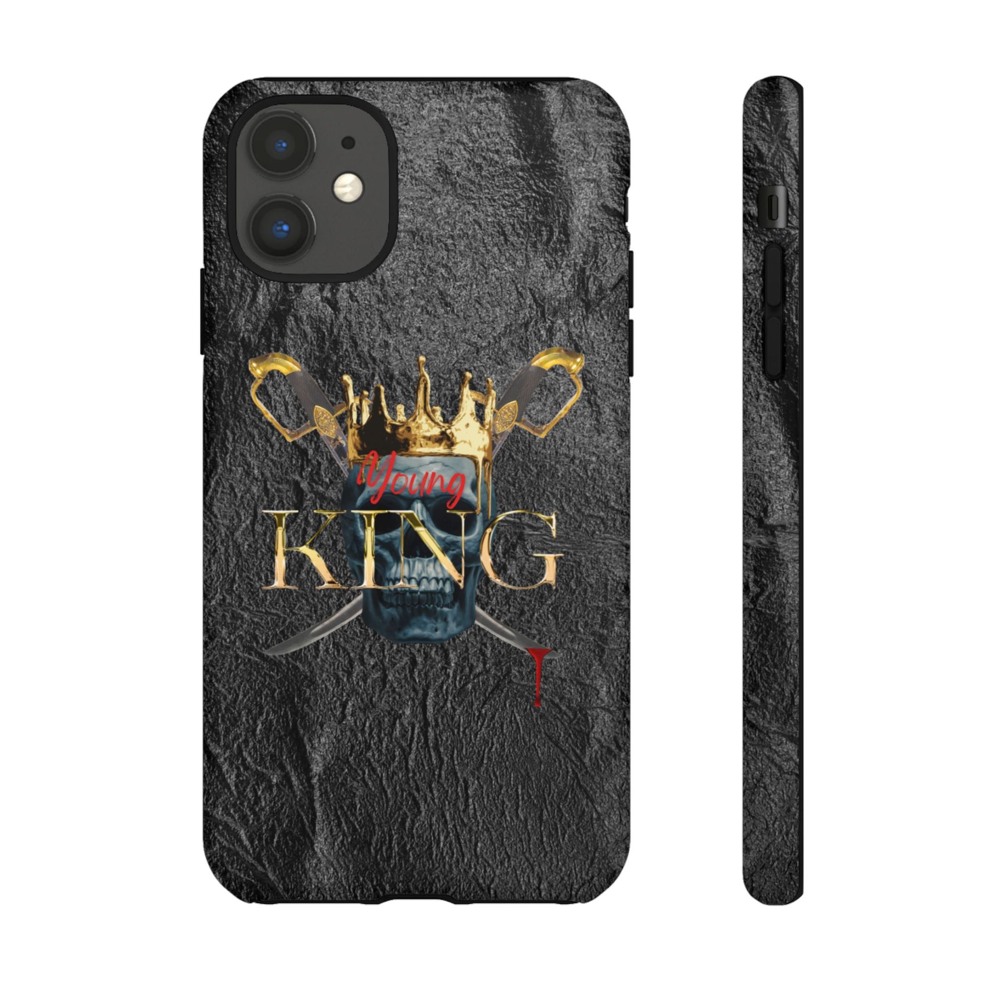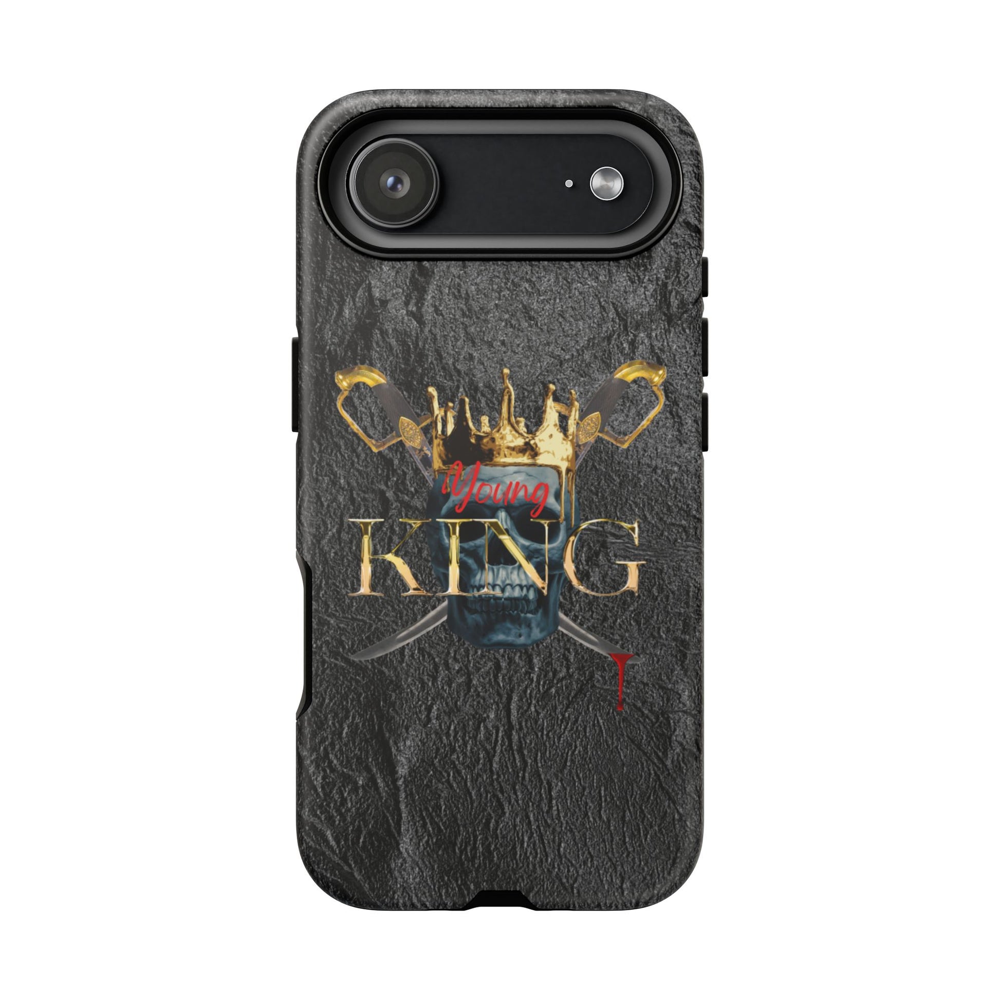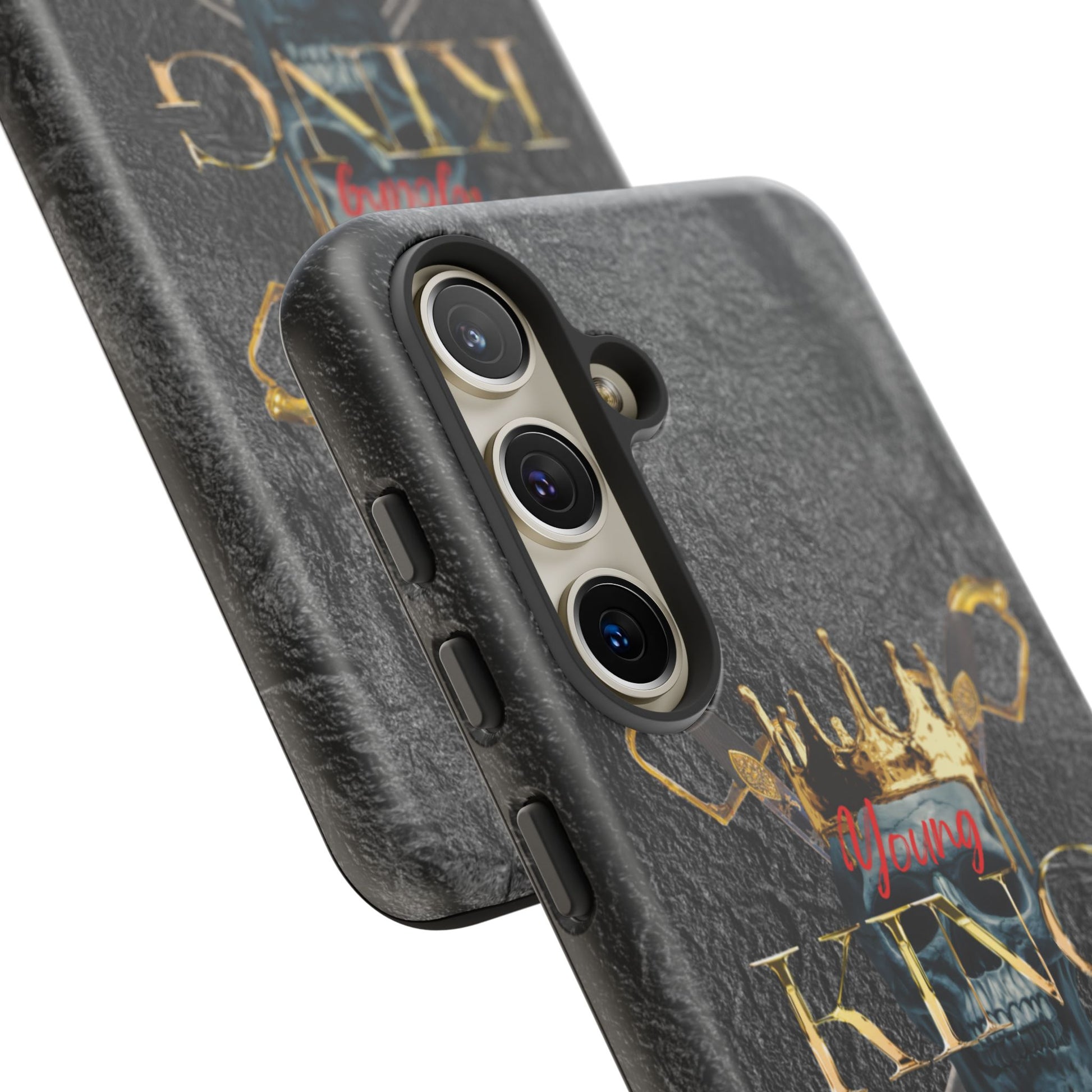 Dark royalty, real protection. This dual-layer protective case features the Young King design—a gold crown with skull imagery, bold lettering, and gritty street-style energy—so your phone looks like a statement piece while staying protected from everyday bumps and drops.