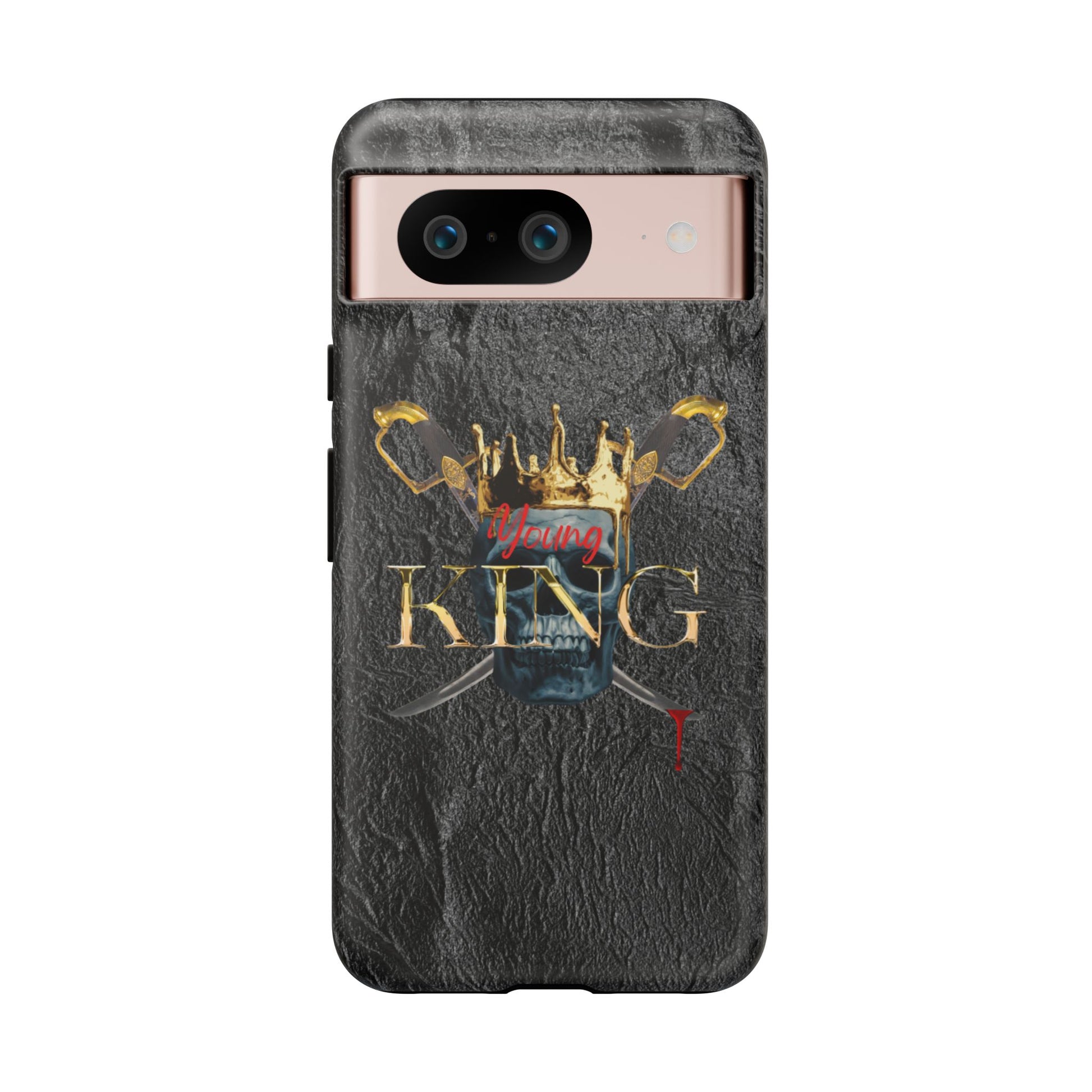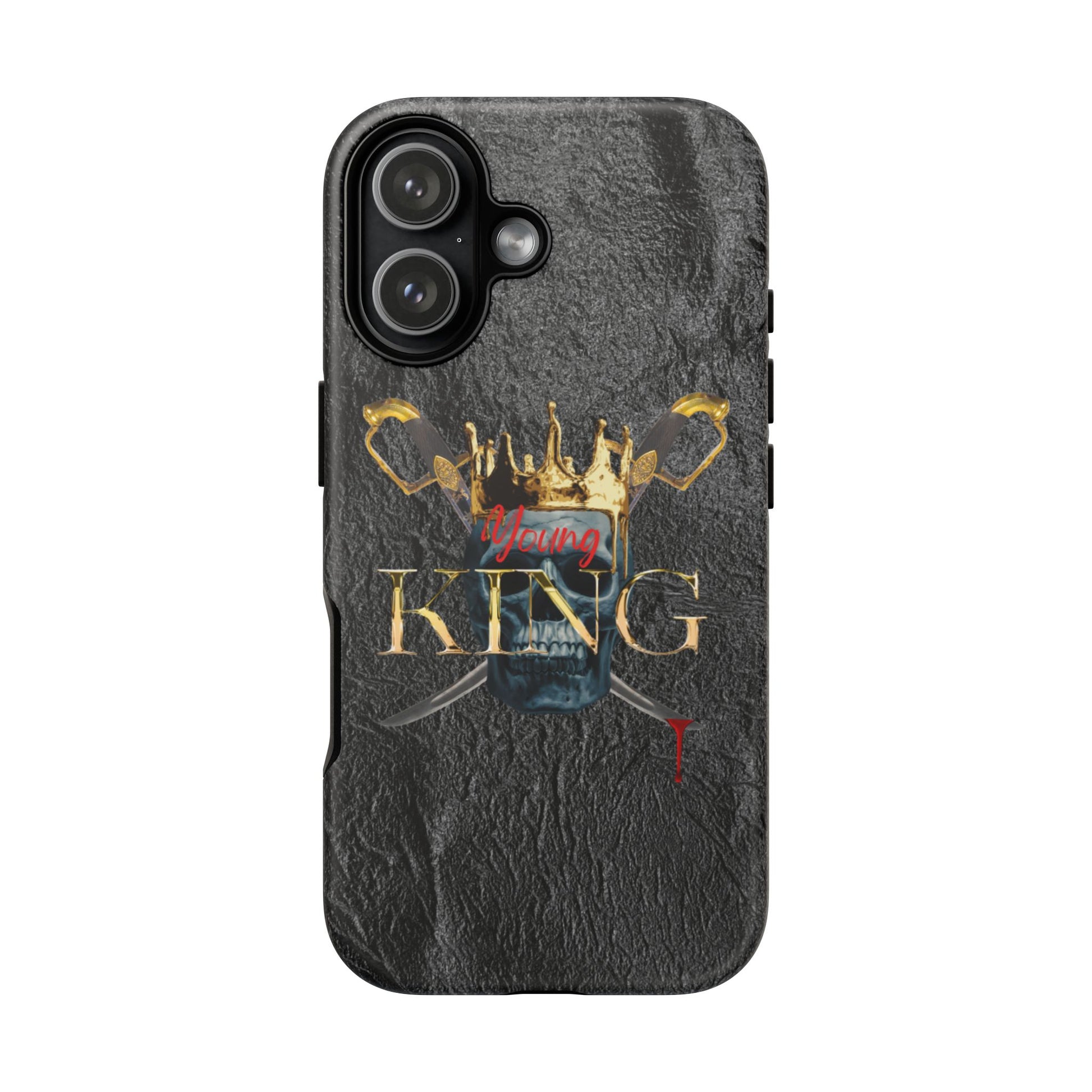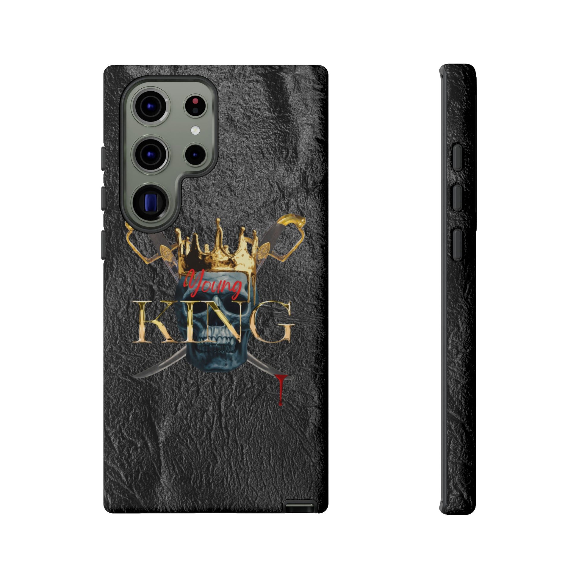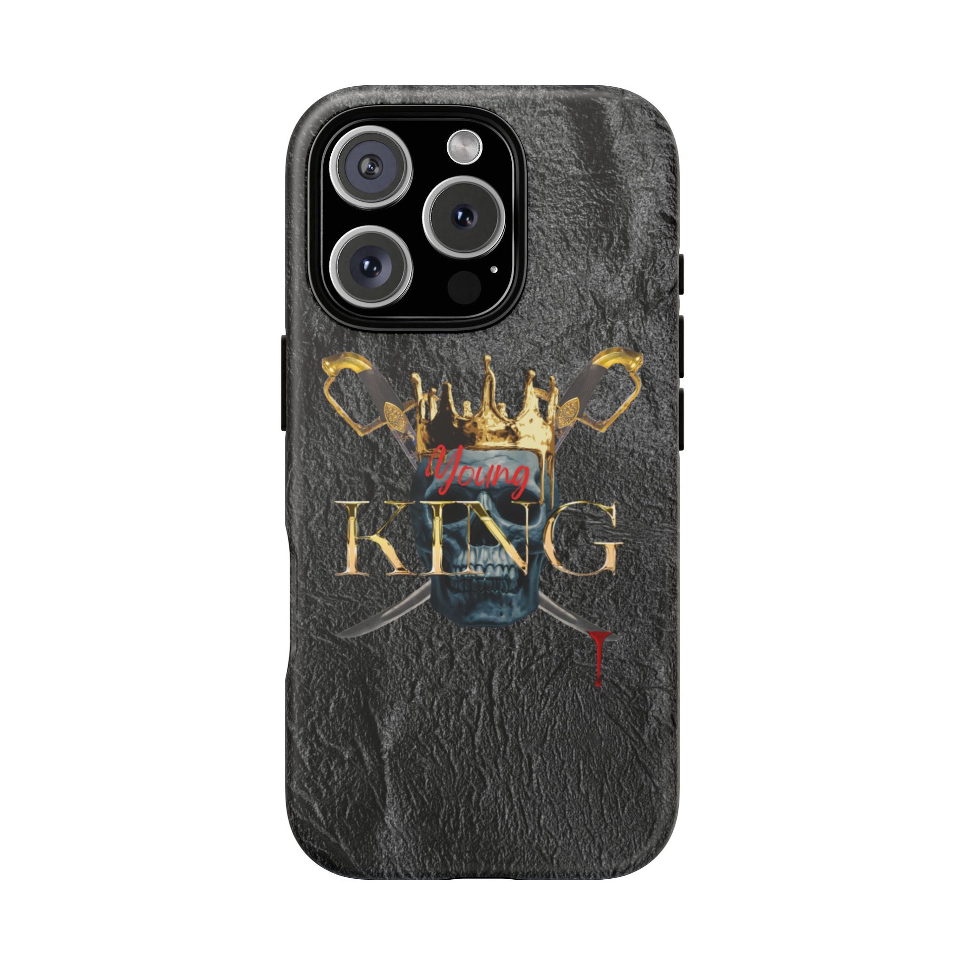 Dark royalty, real protection. This dual-layer protective case features the Young King design—a gold crown with skull imagery, bold lettering, and gritty street-style energy—so your phone looks like a statement piece while staying protected from everyday bumps and drops.