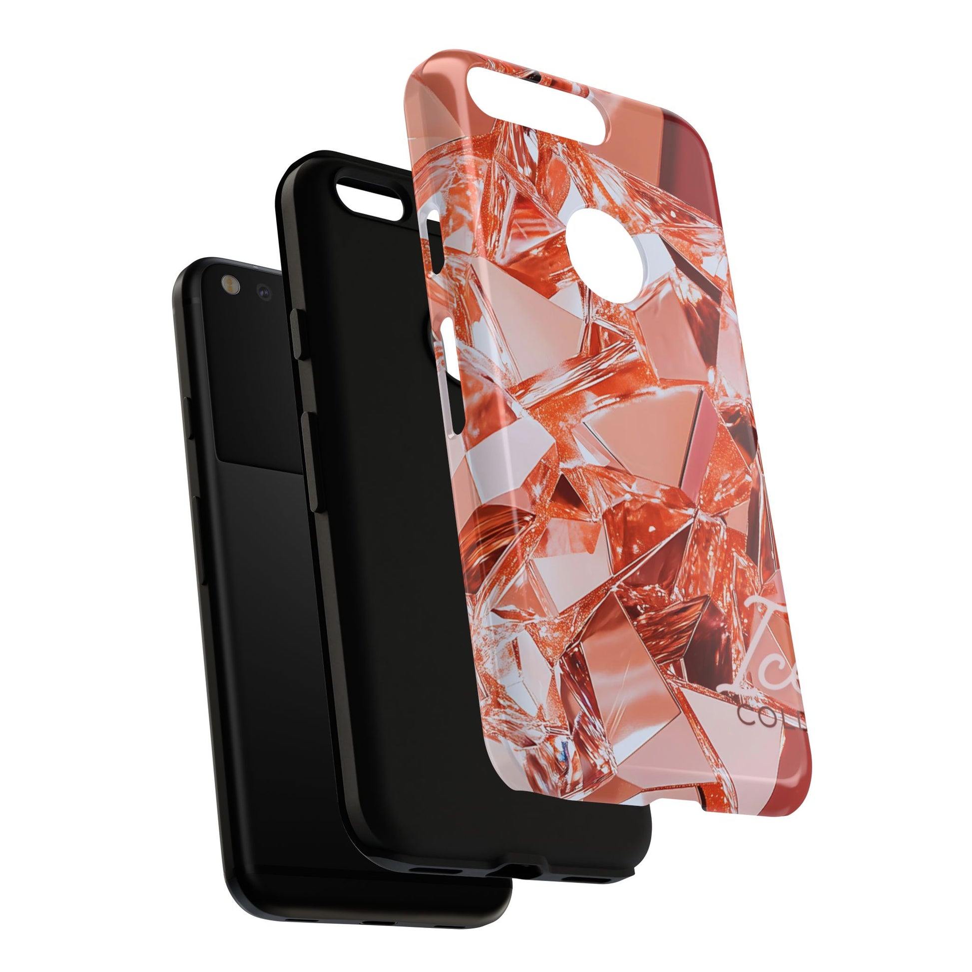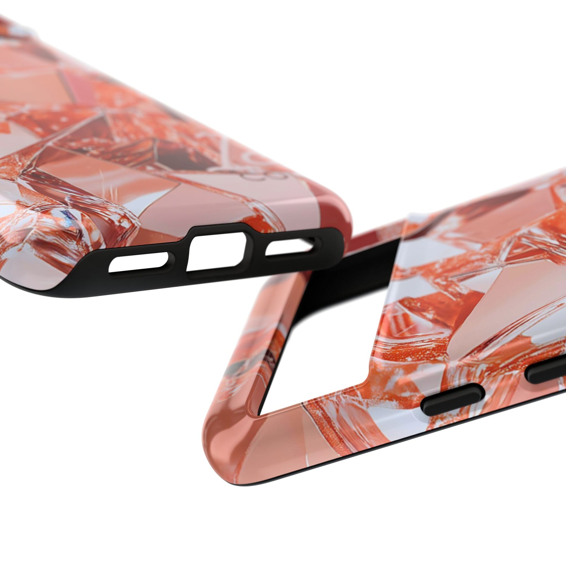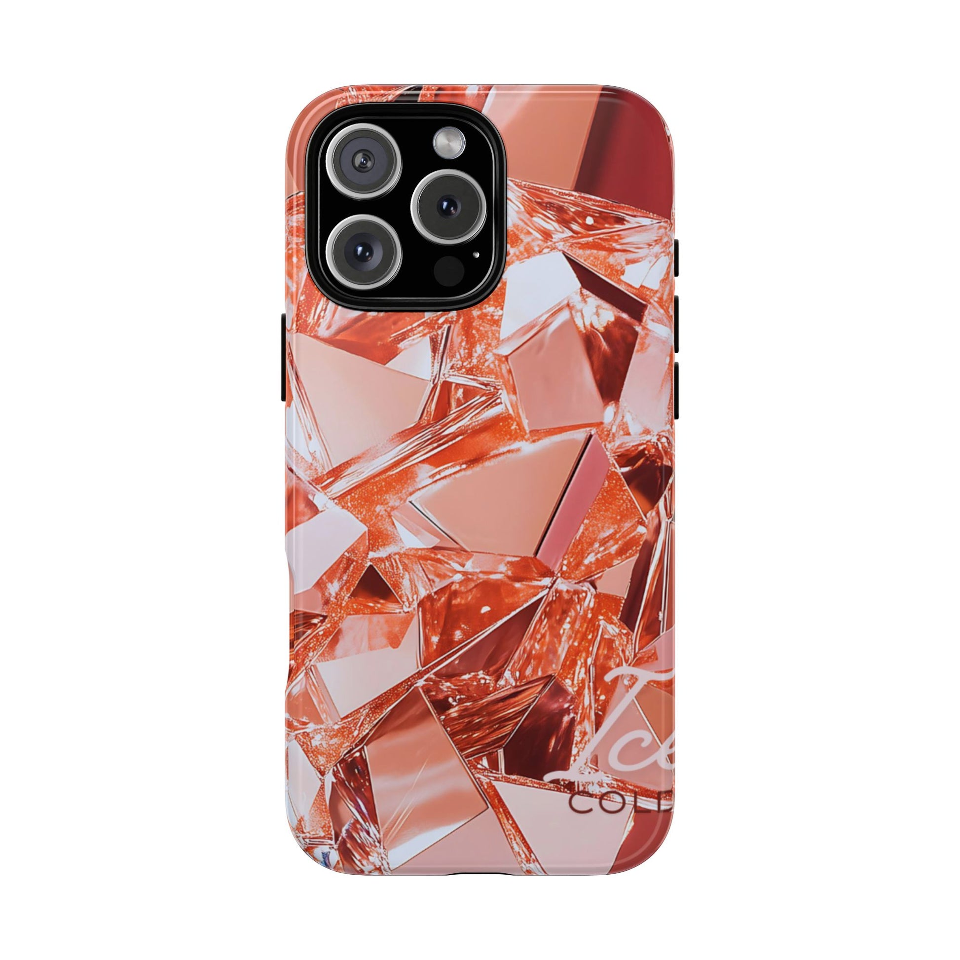 This protective phone case brings a warm, faceted sparkle to everyday carry. The design features a close-up mosaic of rose-gold shards that catch the light and read like a modern gemstone—lively highlights, soft metallic tones, and an all-over wrap that continues around the edges. Built as a dual-layer shell with a smooth TPU silicone liner, it cushions drops and resists wear while keeping ports open and wireless charging usable.