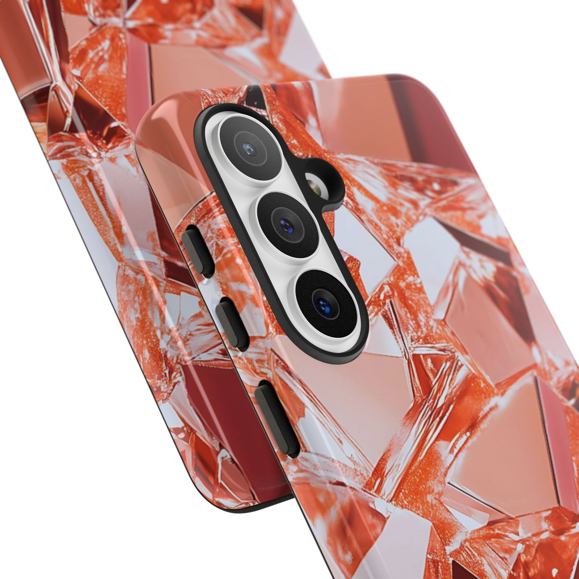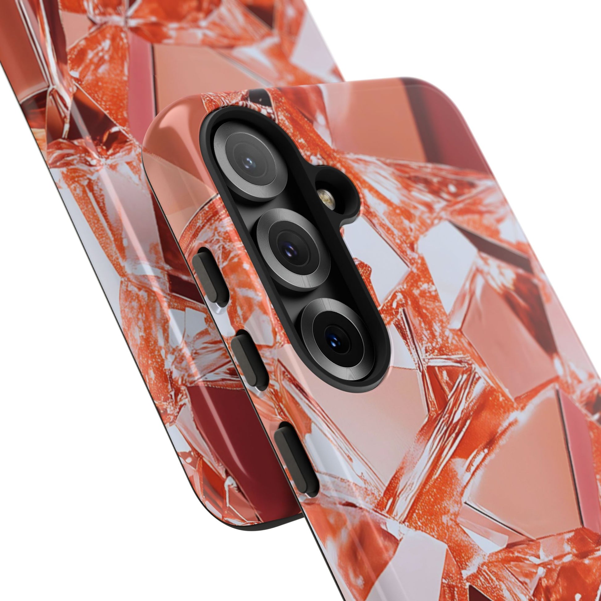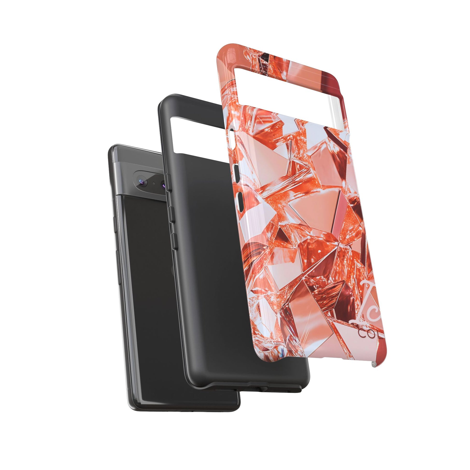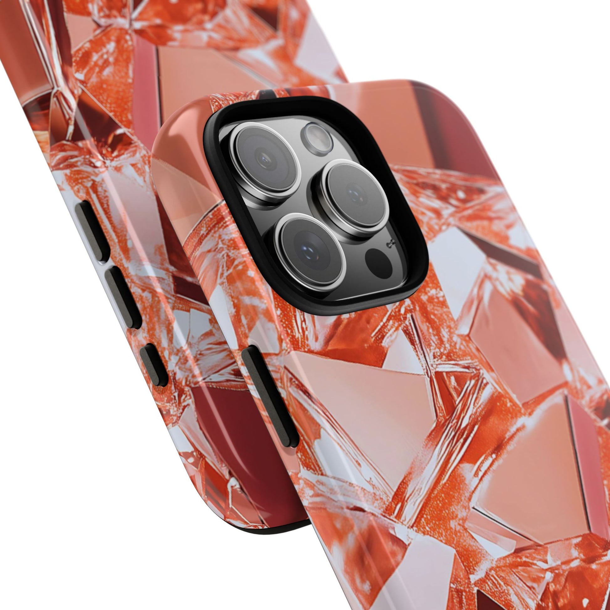 This protective phone case brings a warm, faceted sparkle to everyday carry. The design features a close-up mosaic of rose-gold shards that catch the light and read like a modern gemstone—lively highlights, soft metallic tones, and an all-over wrap that continues around the edges. Built as a dual-layer shell with a smooth TPU silicone liner, it cushions drops and resists wear while keeping ports open and wireless charging usable.