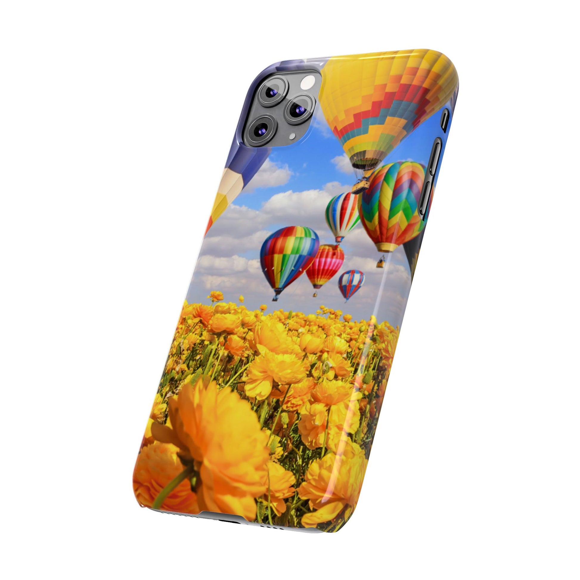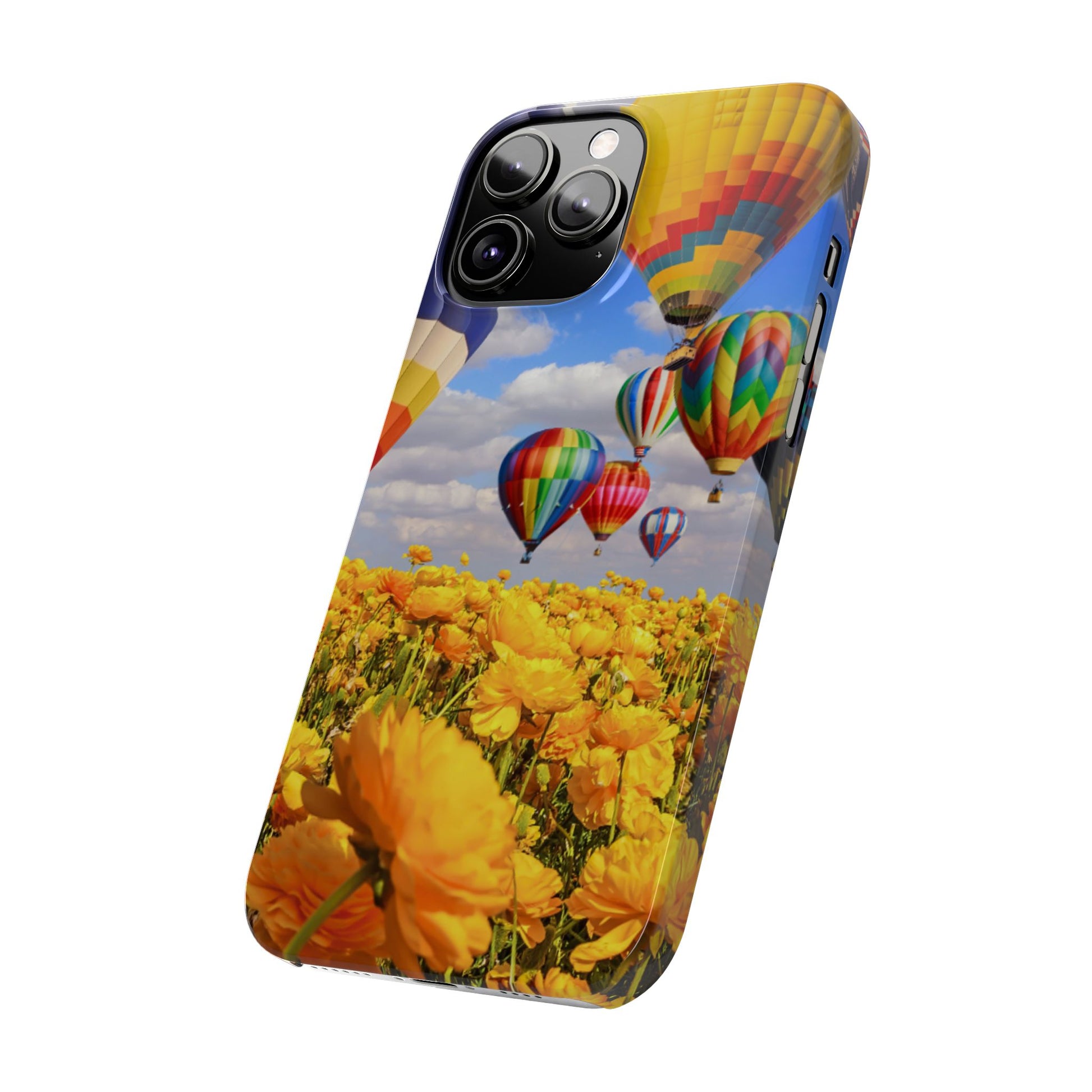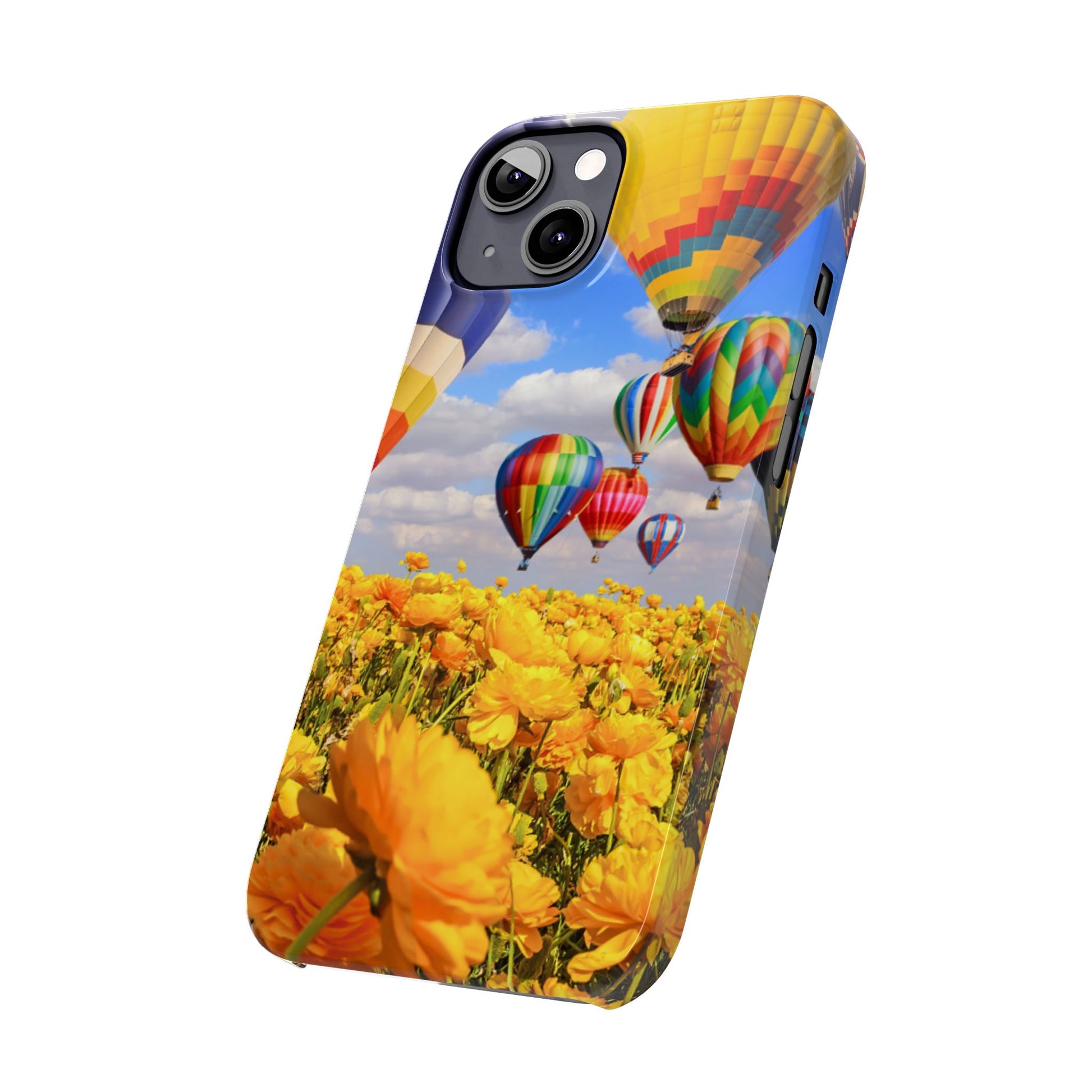 Lift your everyday style with this slim phone case featuring vibrant hot air balloons soaring above a golden flower field under bright blue skies. Bursting with color, movement, and cheerful energy, this uplifting design captures the joy of adventure and open horizons. Lightweight and sleek, it offers everyday protection while turning your phone into a bold statement piece.