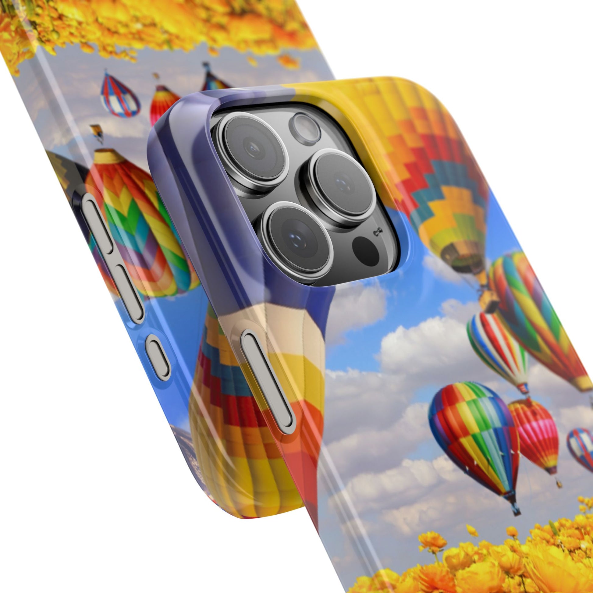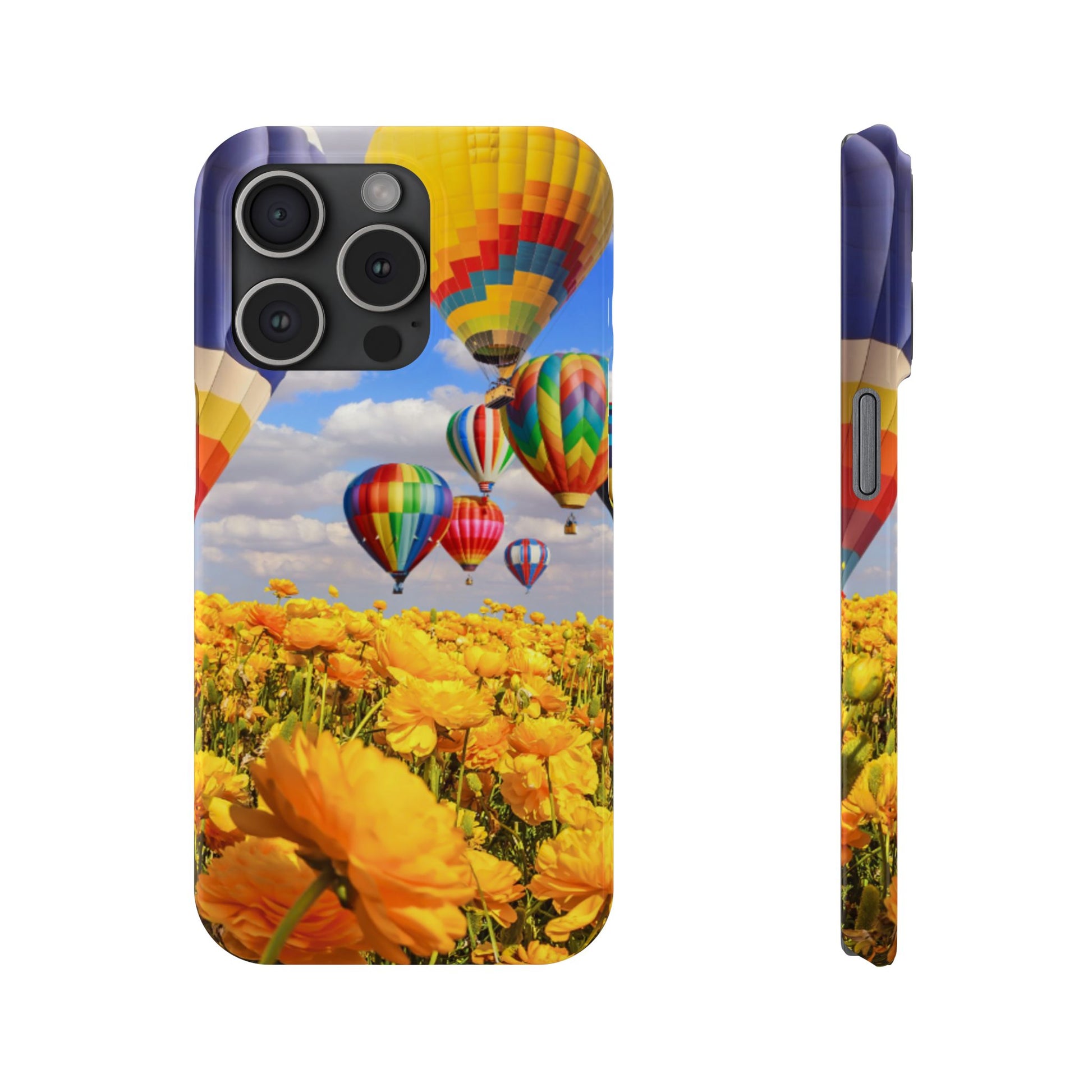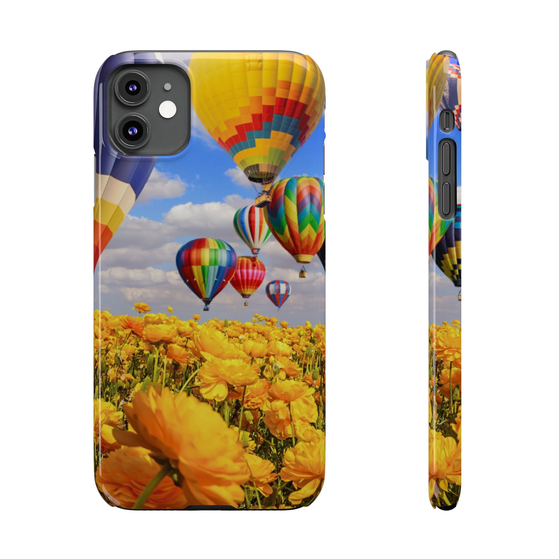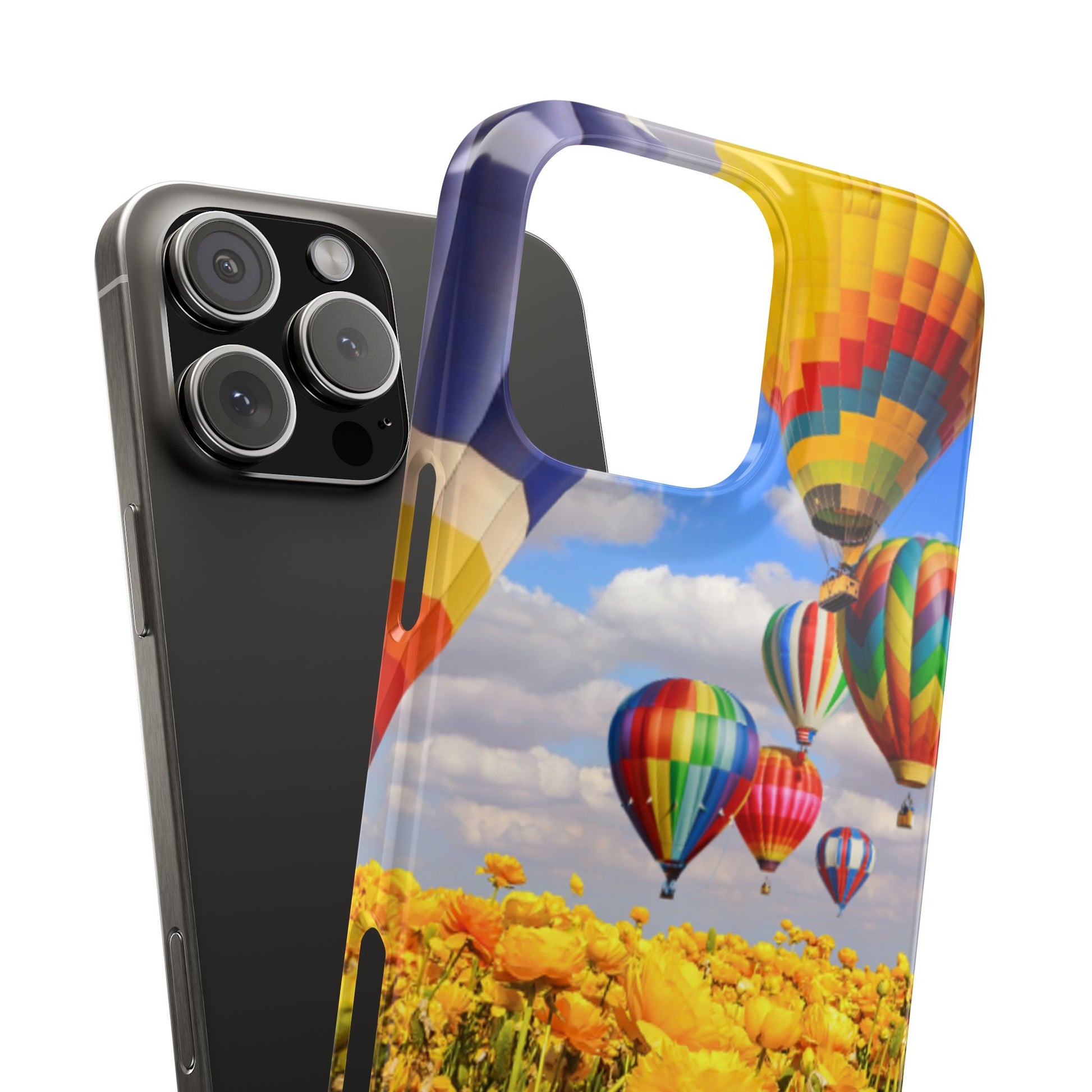 Lift your everyday style with this slim phone case featuring vibrant hot air balloons soaring above a golden flower field under bright blue skies. Bursting with color, movement, and cheerful energy, this uplifting design captures the joy of adventure and open horizons. Lightweight and sleek, it offers everyday protection while turning your phone into a bold statement piece.