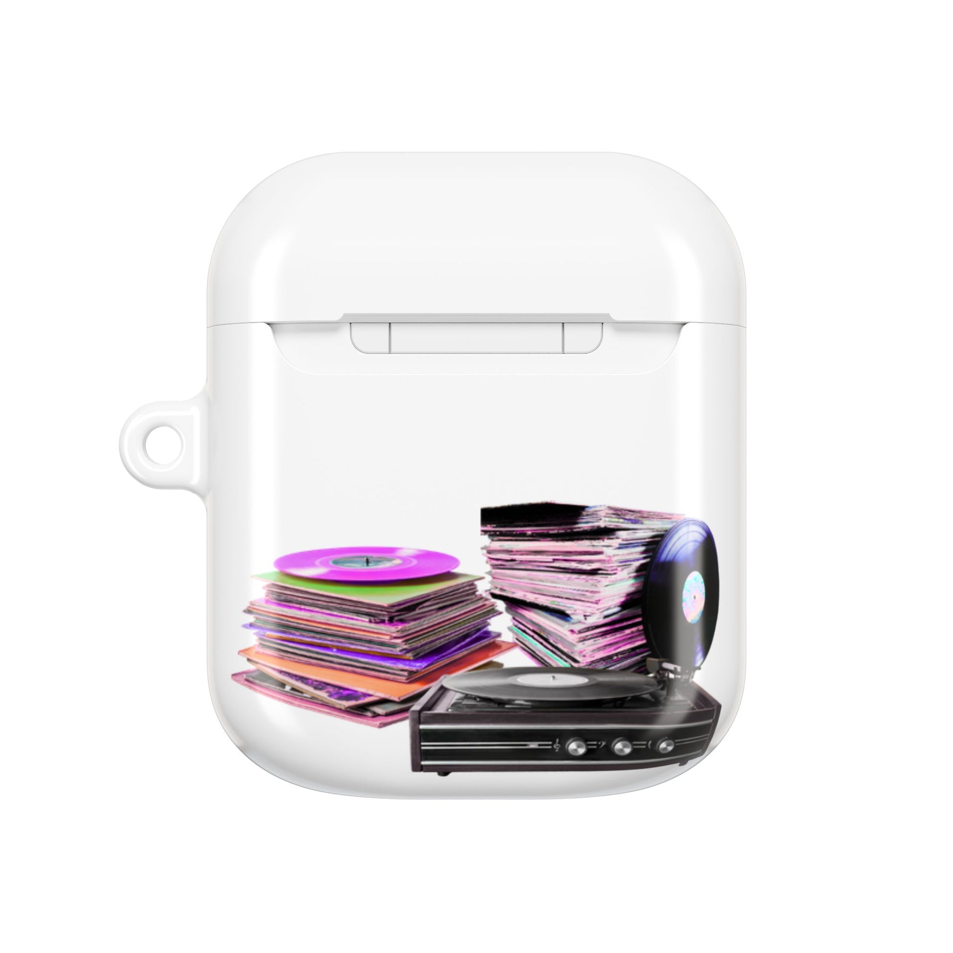 A little throwback for your everyday carry. This glossy case cover features the 70s Spin design with colorful stacked records and retro lettering—perfect for keeping your earbuds protected while adding warm, nostalgic charm to your keys or bag. Clip it on with the included carabiner and keep your essentials close.
