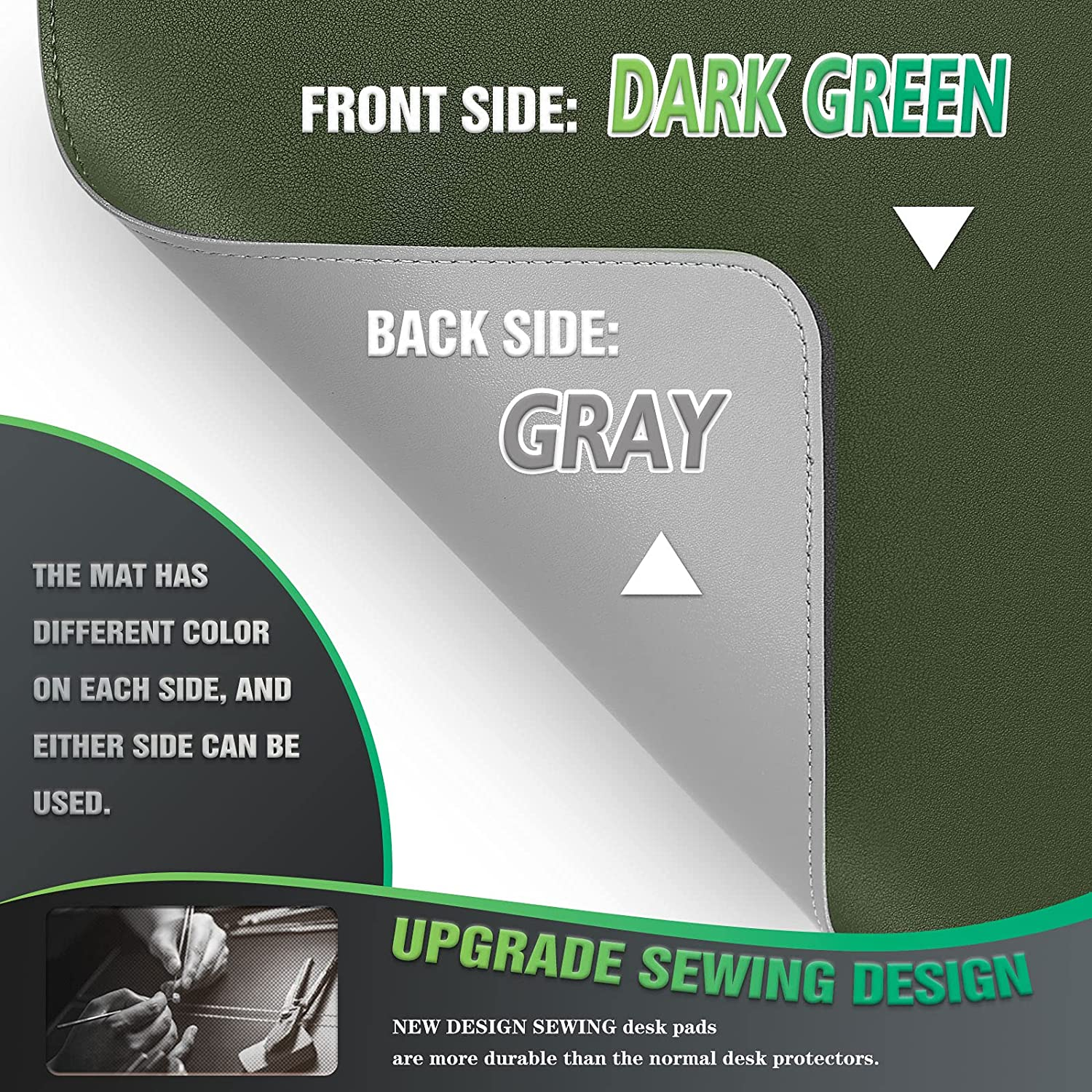 Desk Pad Protector – Dual-Sided PVC Leather Desk Mat, Waterproof & Heat-Resistant, Stitched Edges, Dark Green, 31.5" x 15.7"
