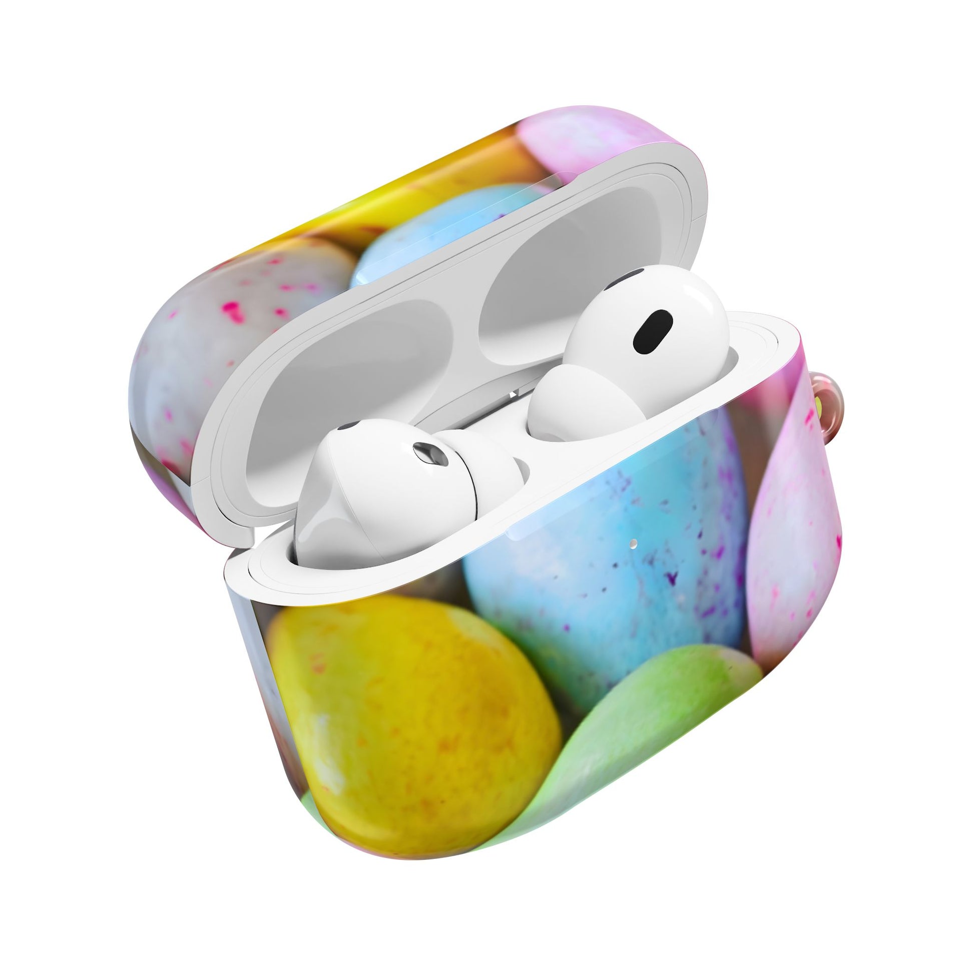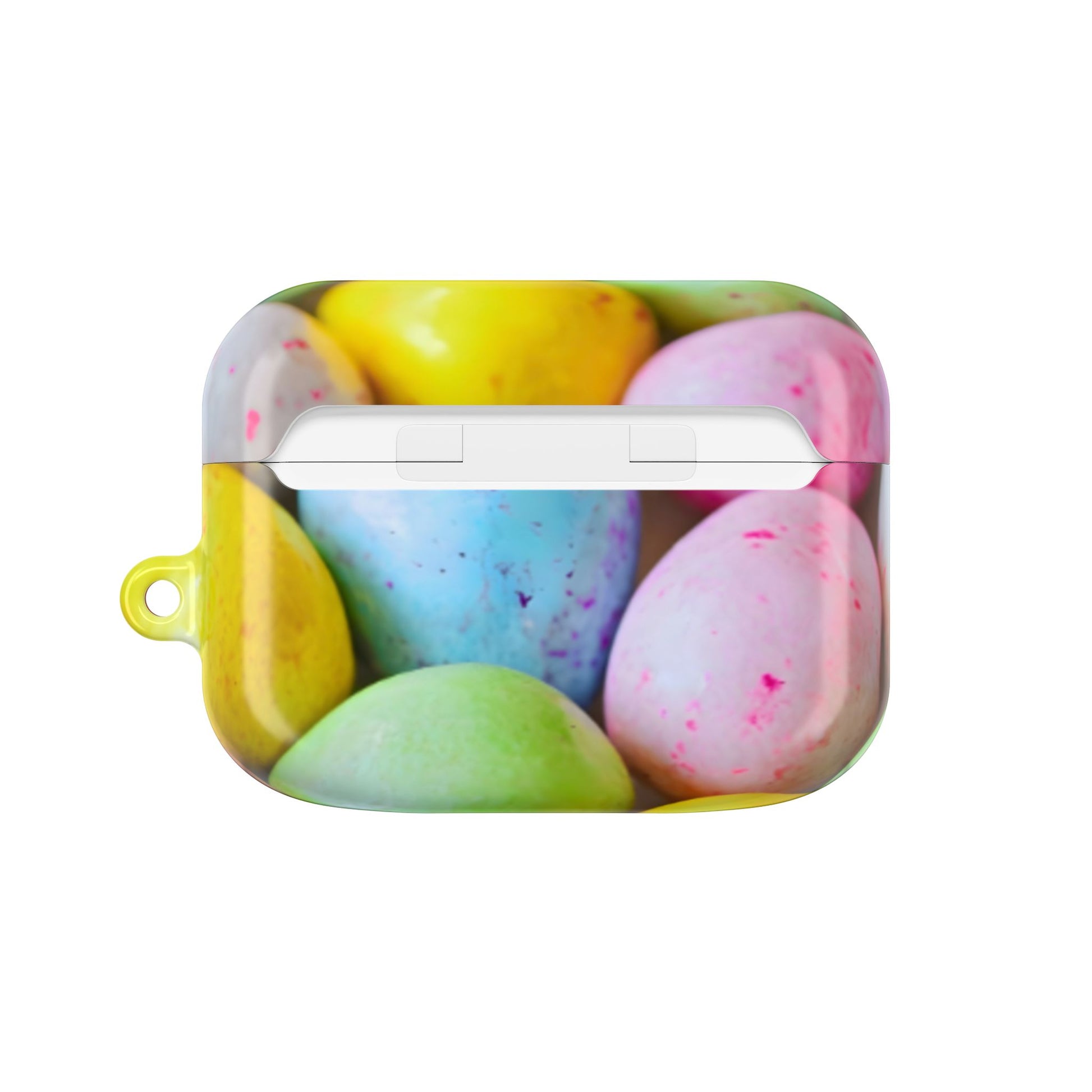 Bright, glossy protection for your earbuds that brings a playful pop of color to everyday carry. This slim, lightweight case wraps your earbuds in a hard polycarbonate shell printed with candy-speckled pastel eggs. It snaps on for secure coverage, leaves the charging port accessible for wireless charging, and includes a handy carabiner so you can clip it to a bag or keyring. Built to resist scratches and everyday bumps, the case keeps your earbuds safe while making a cheerful statement.