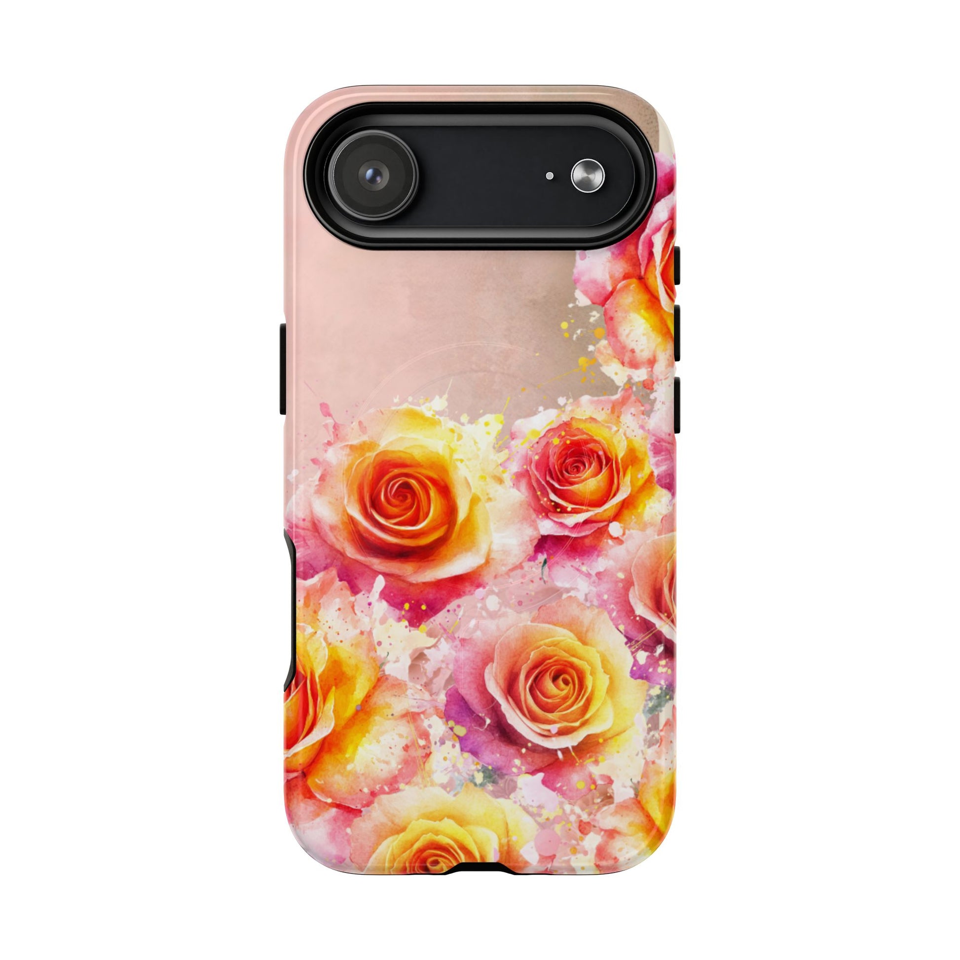This slim, dual-layer phone case brings warm, painterly roses to your daily carry while keeping your device safe. The vivid 3D-wrap print captures bursts of yellow and coral petals on a soft blush background, giving the case an artful, feminine feel that pairs with both casual and dressed-up looks. Inside, a TPU silicone liner cushions bumps and drops while the rigid polycarbonate shell resists impacts and scratches. The built-in magnetic module works with magnetic accessories for hands-free mounting and effortless charging.