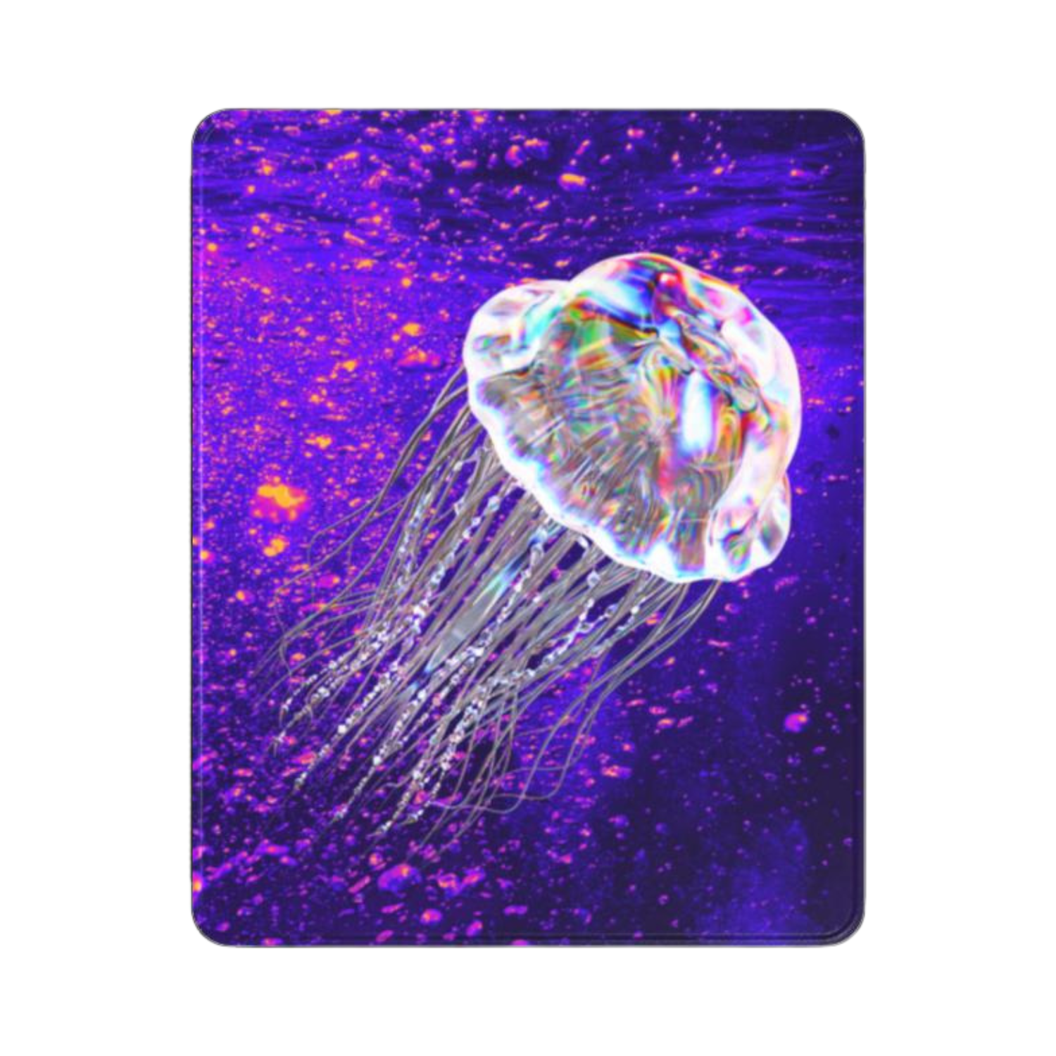 Deep dive into your setup. This tablet case features the Jellyfish Drift design—a holographic jellyfish glowing through a cosmic purple void—so your workspace feels like a portal to somewhere electric. The slim build snaps on clean, the microfiber-lined interior helps prevent scratches, and the built-in stylus holder keeps your pen right where you need it.